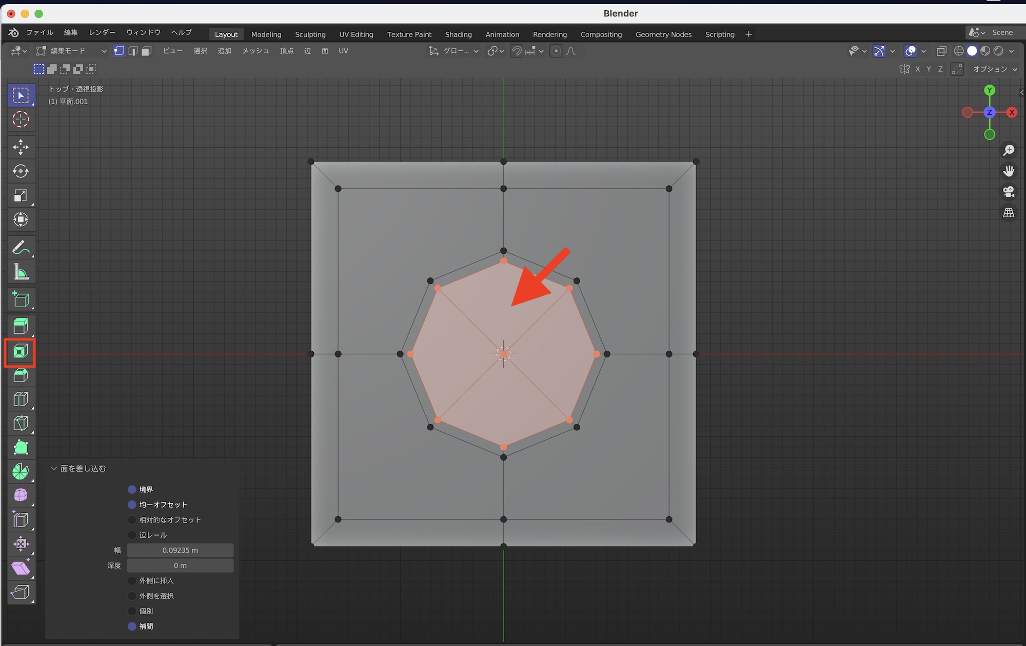 オプションが表示された状態で「セグメント」を「2」にして、「シェイプ」を「0.085」にすると八角形ができます。面が選択された状態で、「面を差し込む(I)」で内側に面をさらに作成し、中心の面を削除します。