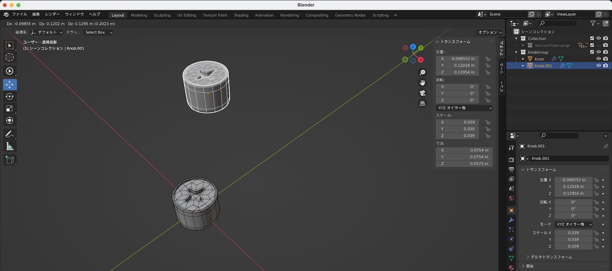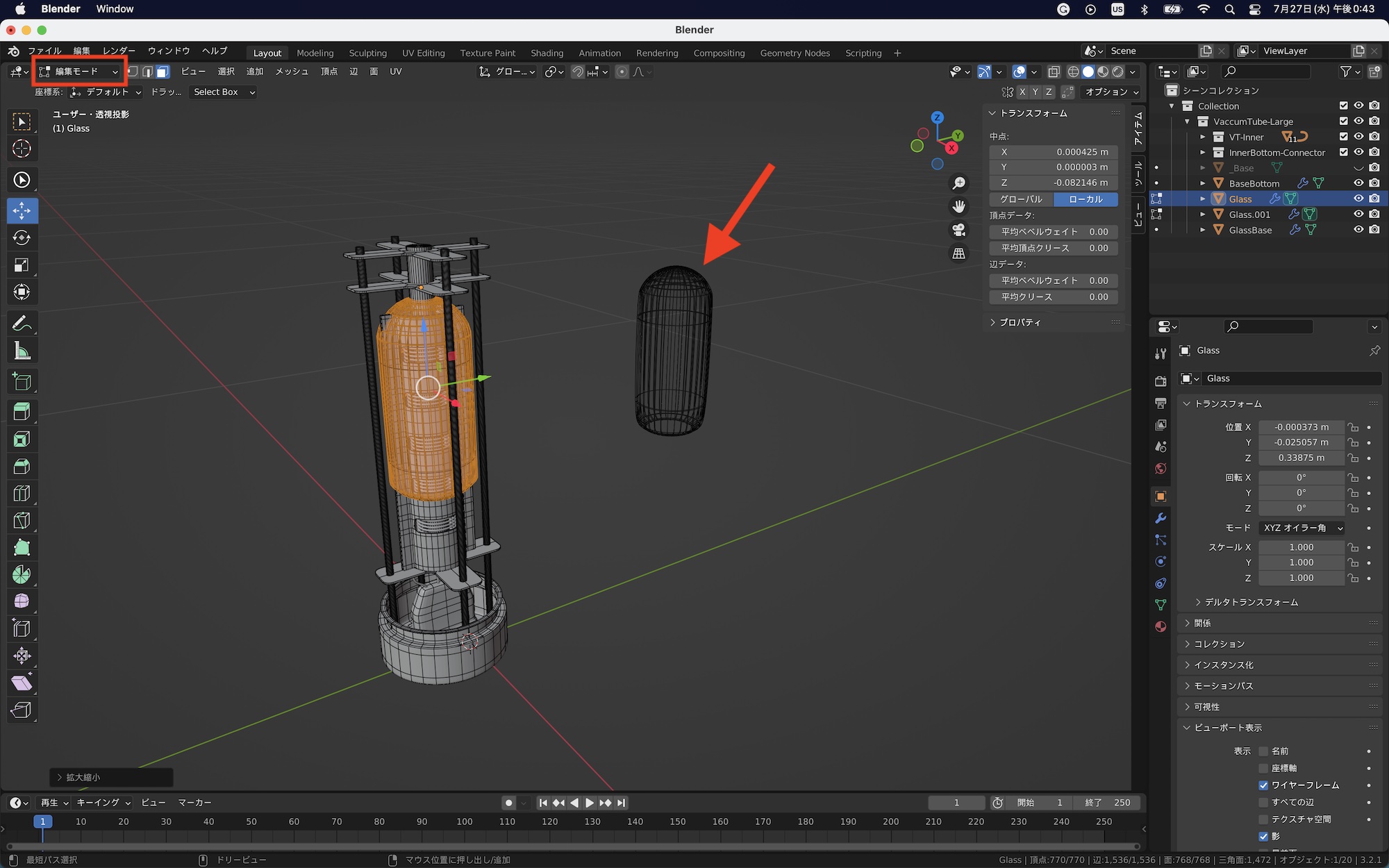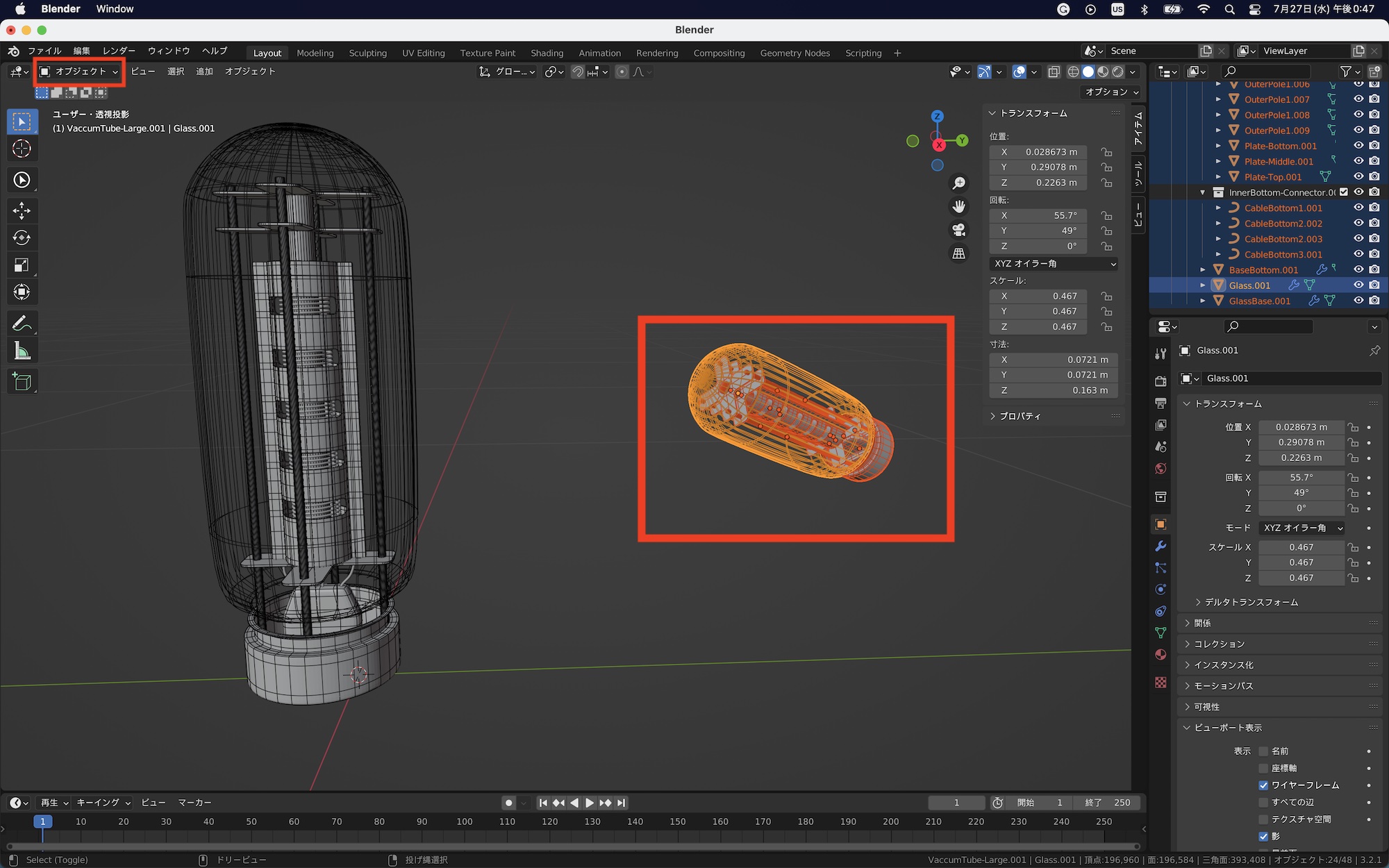 下の例では真空管のガラスをリンク複製した場合です。オブジェクトモードでスケールを変更しても複製したオブジェクトは変形しませんが、編集モードで操作すると同じように影響を受けます。