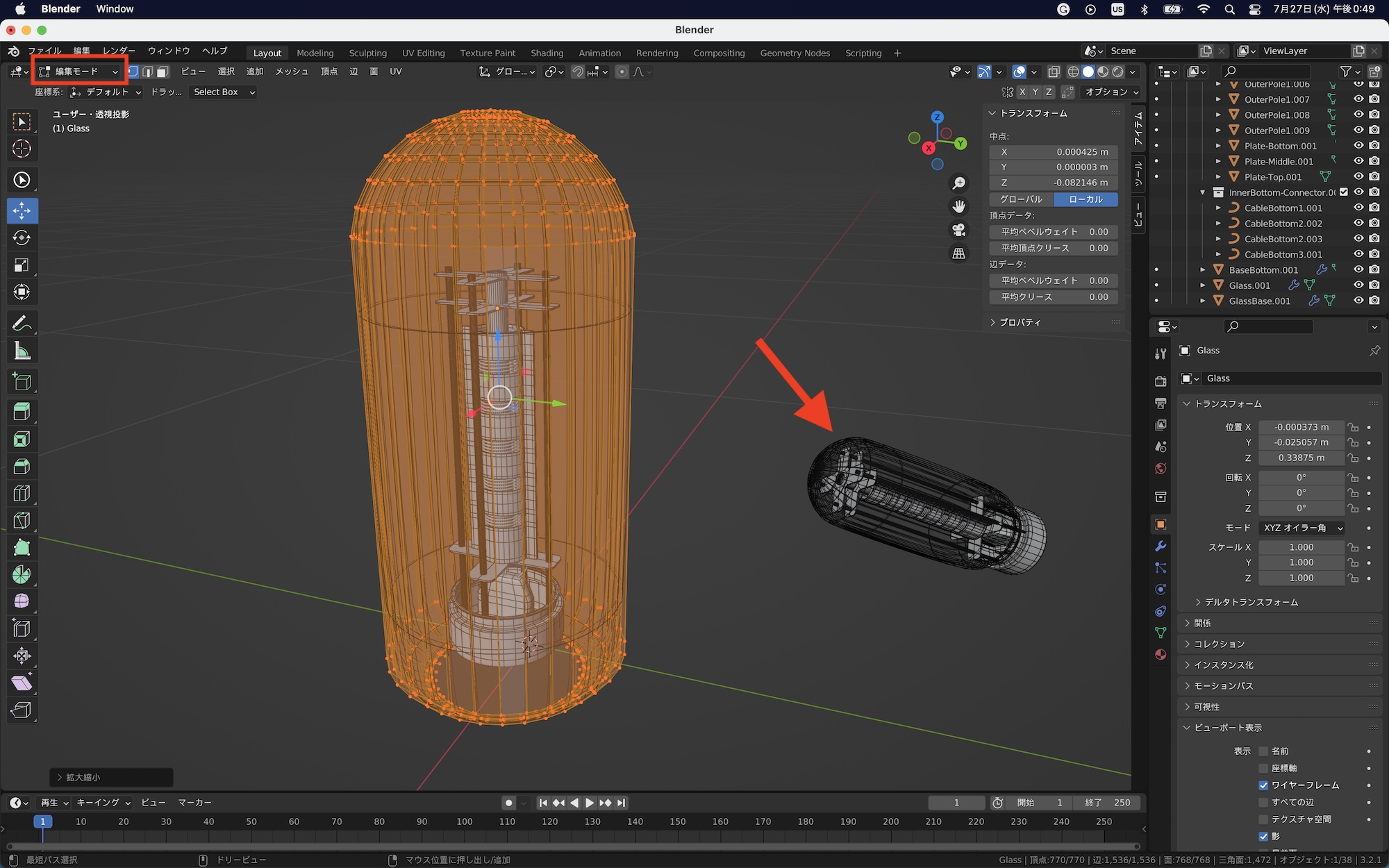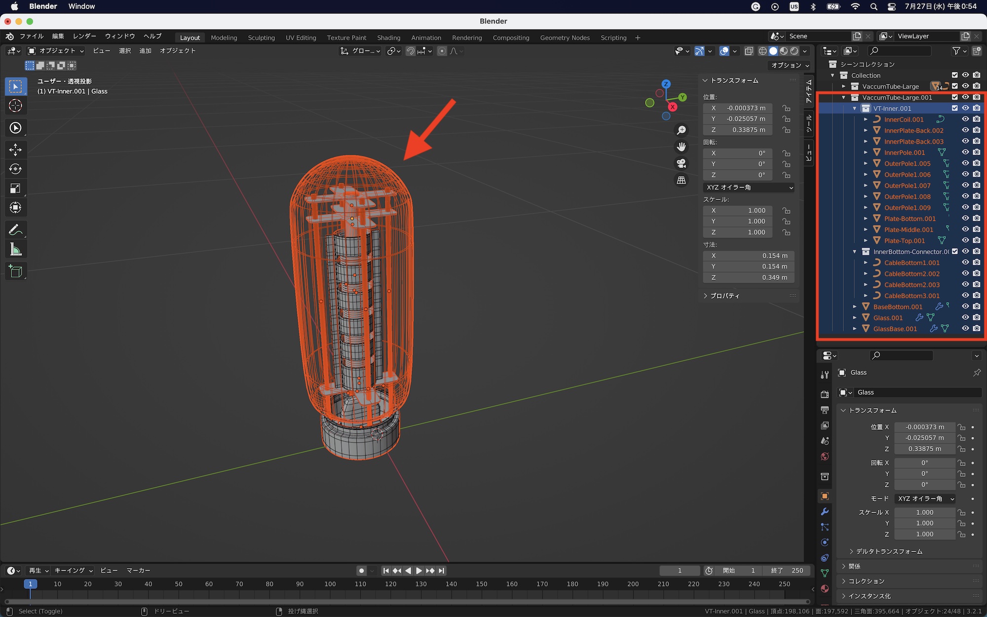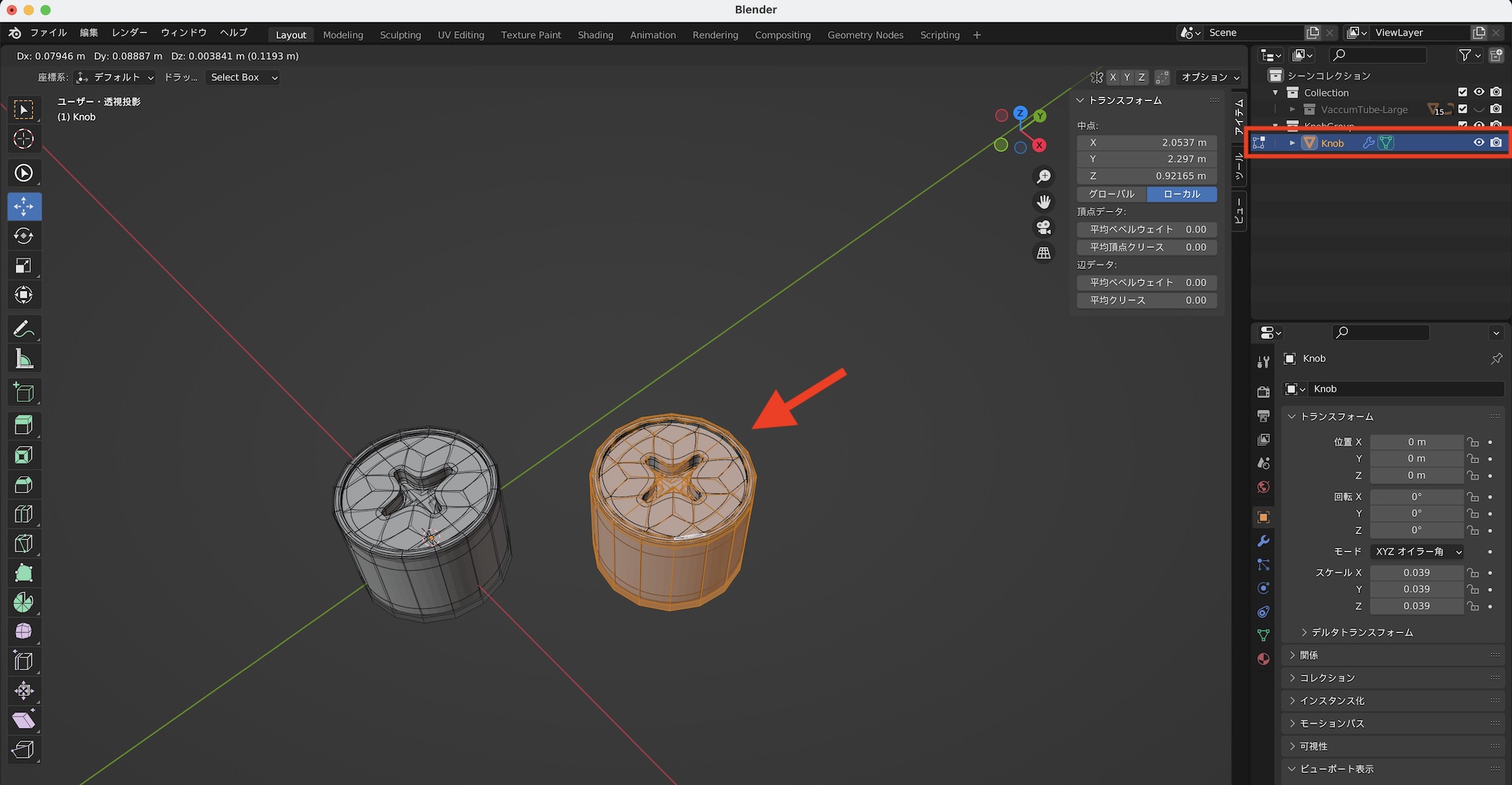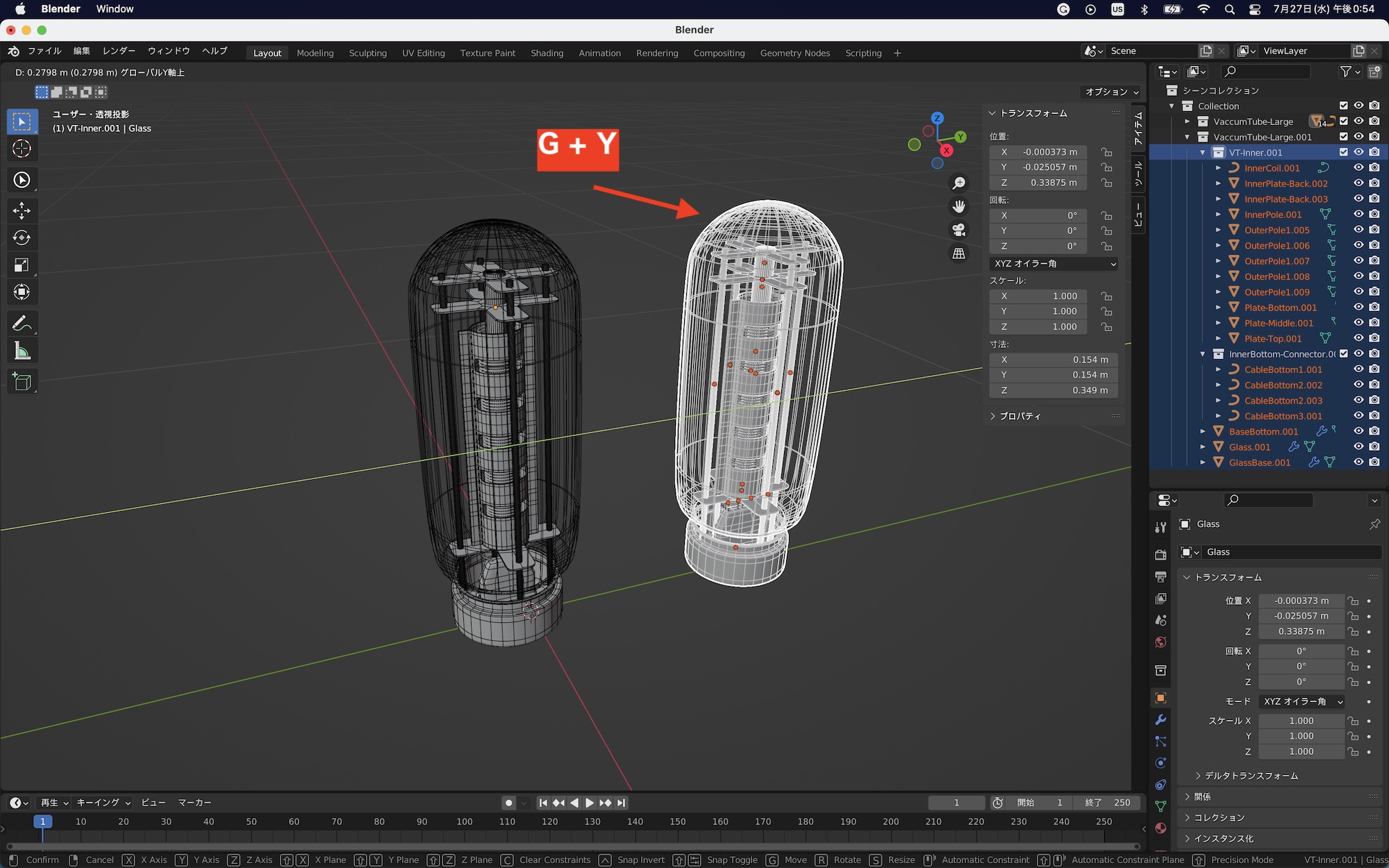 下の例では真空管のガラスをリンク複製した場合です。オブジェクトモードでスケールを変更しても複製したオブジェクトは変形しませんが、編集モードで操作すると同じように影響を受けます。