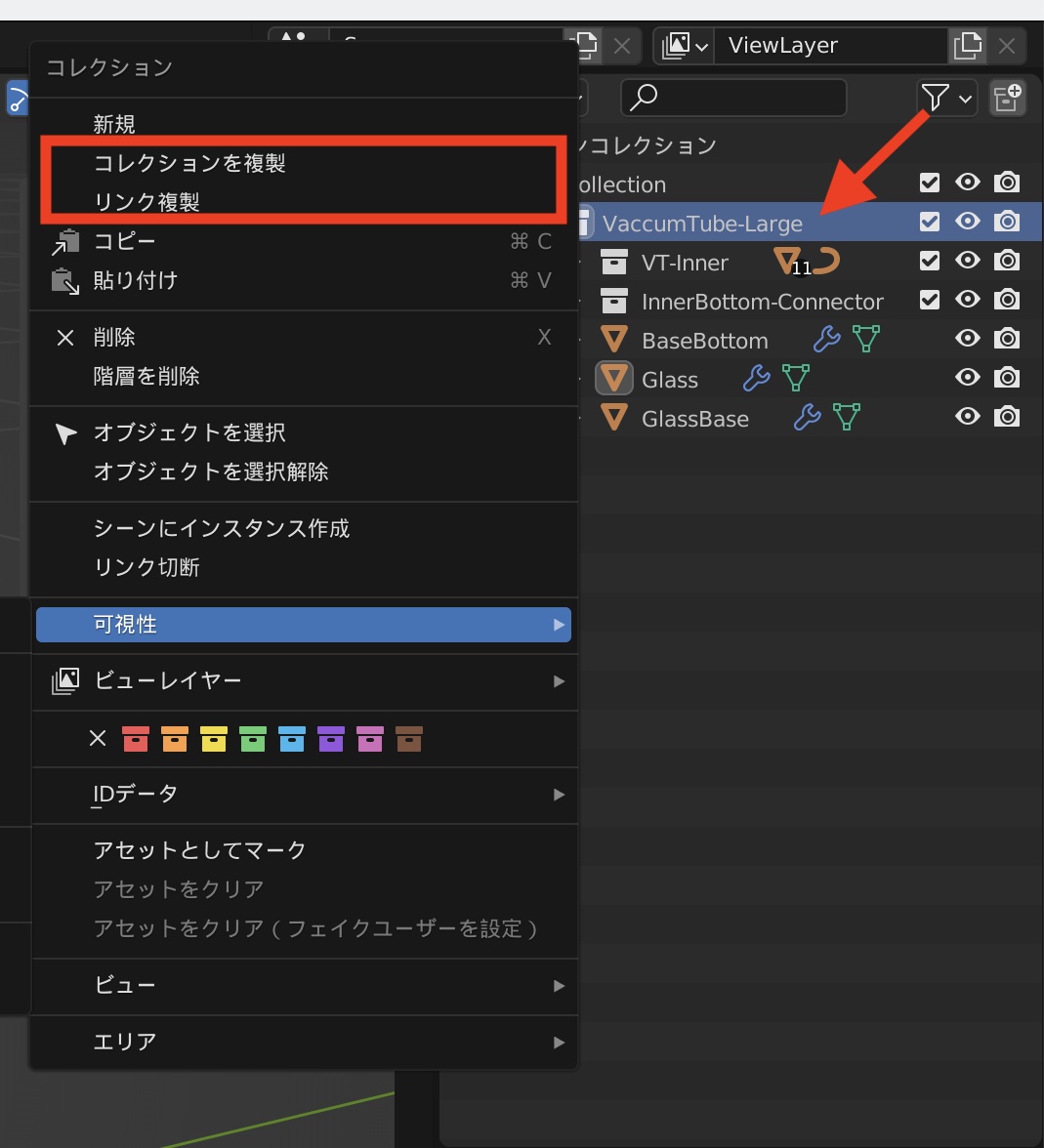 Blenderではビューポート上でオブジェクトやメッシュを複製するほか、アウトライナーでコレクションを複製することもできます。アウトライナーで複製したいコレクションを選択して、右クリック「コレクションを複製」または「リンク複製」を選択します。すると、オブジェクトを格納したコレクションごと複製されます。