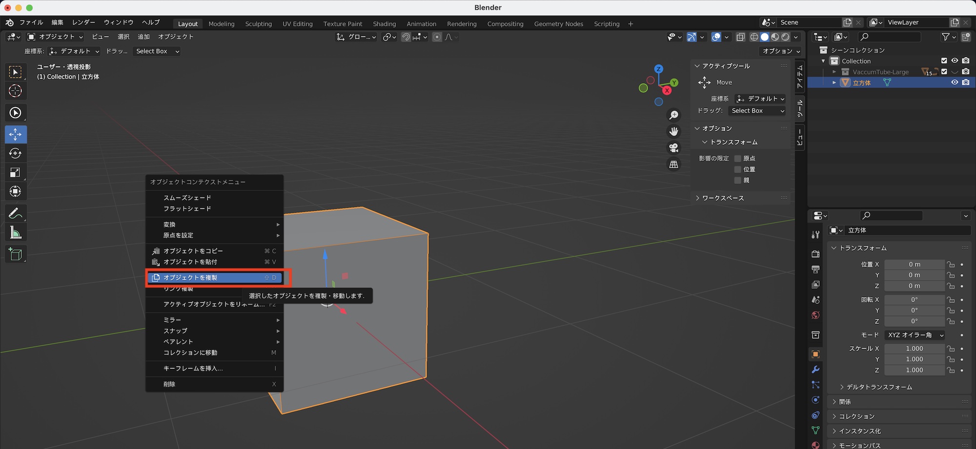 通常の複製はオブジェクトモードか編集モードで複製を行いたいオブジェクトまたはメッシュを選択して、右クリック「複製」または「Shift + D」を使います。