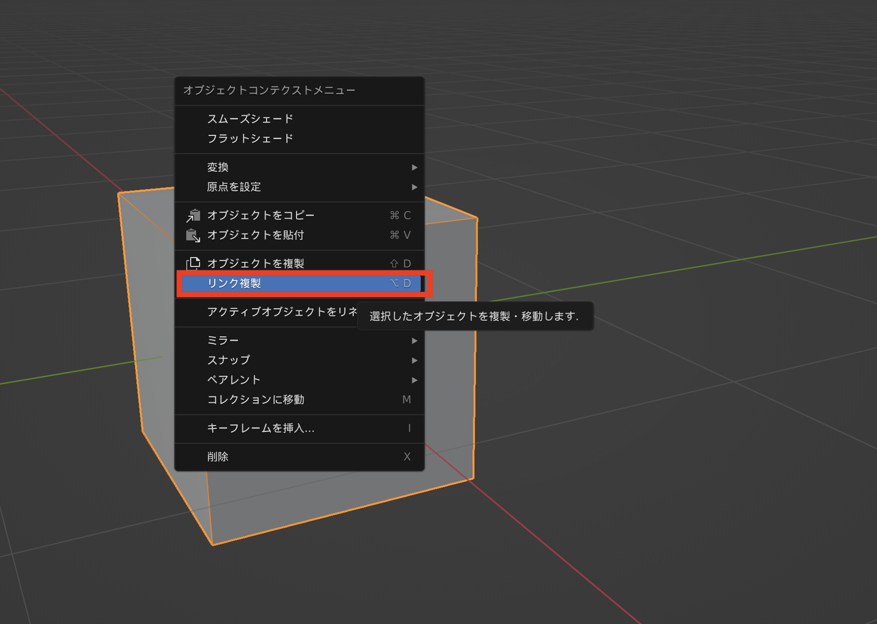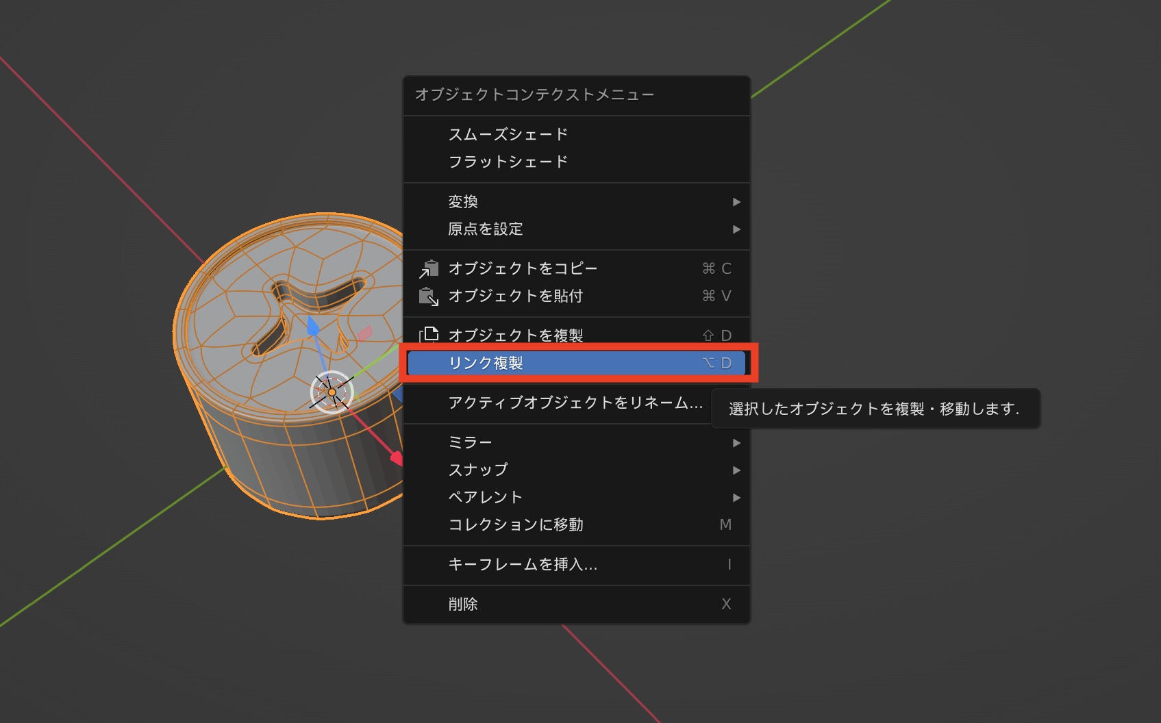 基本的に前の項目で紹介した複製と操作は同じですが、オブジェクトまたはメッシュを選択して右クリック「リンク複製」か「Alt + D」を使います。このリンク複製はオブジェクトモードでしか利用できません。