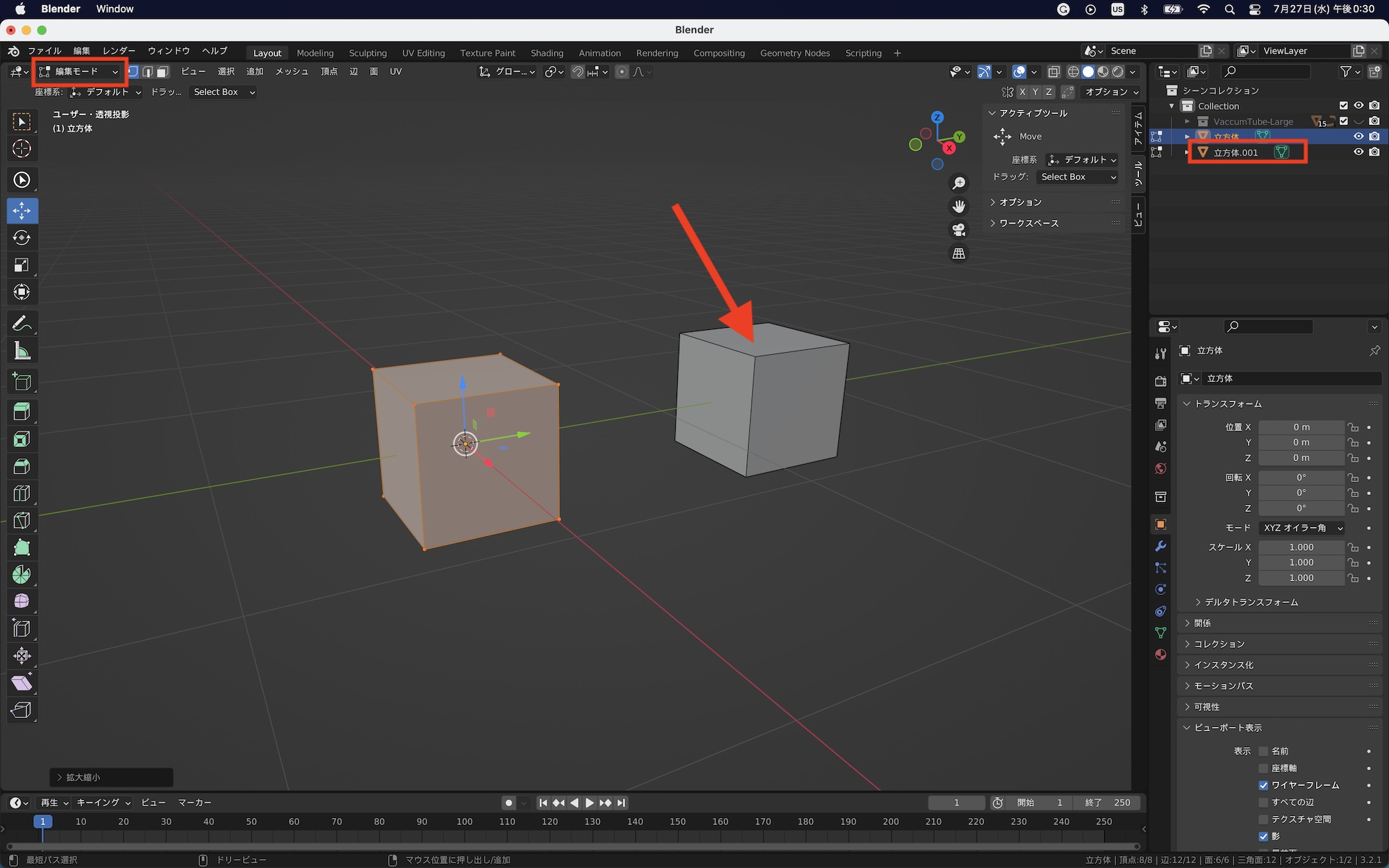 なお、オブジェクトモードで複製した場合は独立したオブジェクトとしてアウトライナーに追加されますが、編集モードで複製した場合は選択したオブジェクトの中で頂点、辺、面を複製したことになるので、別のオブジェクトにはなりません。複製後、すぐに位置を変更しない場合や位置を確定する場合は「Enter」キーを押します。