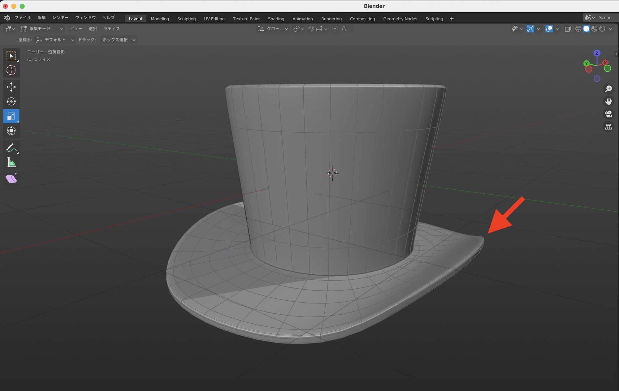 今回変形を加えるのは下の帽子のメッシュ。ベースは出来上がっていますが、帽子のつばの部分に少し丸みを加えたいと考えています。