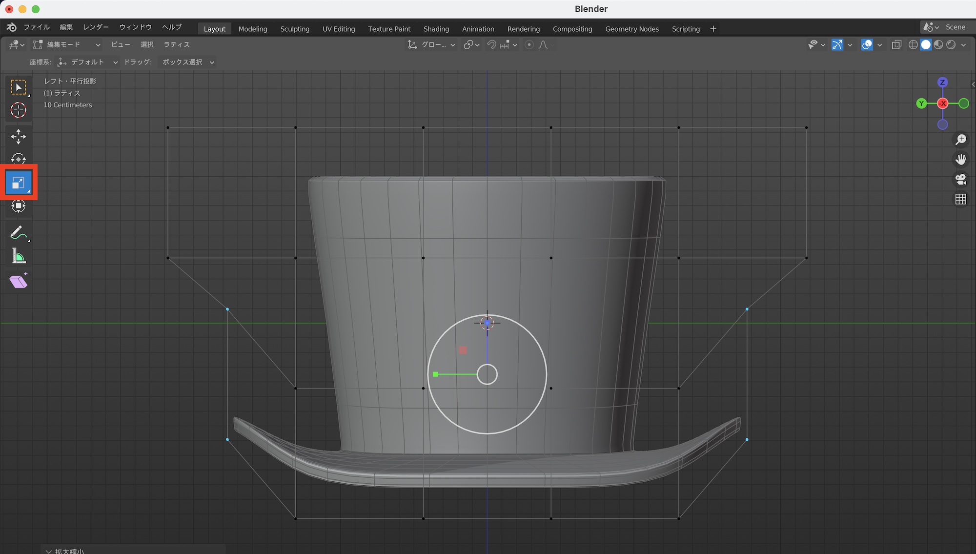 頂点が選択された状態で、スケールツールを使ってY軸方向を少し小さくします。