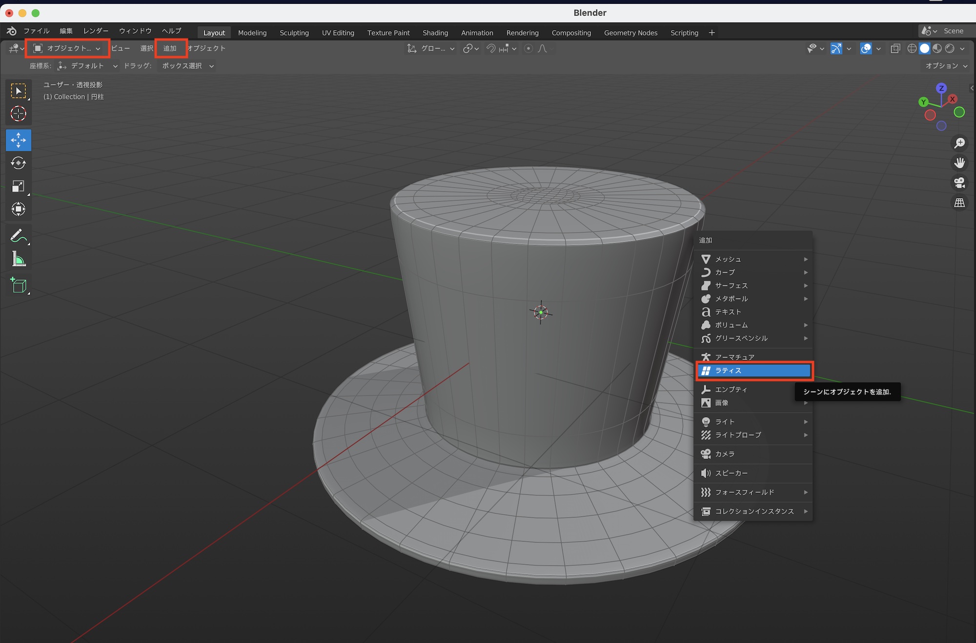 ラティスモディファイアーを追加しただけではメッシュに変形を加えることができないので、一度オブジェクトモードに切り替え、「Shift + A」またはビューポート上部の「追加」から「ラティス」を選択し、ラティスオブジェクトを追加します。