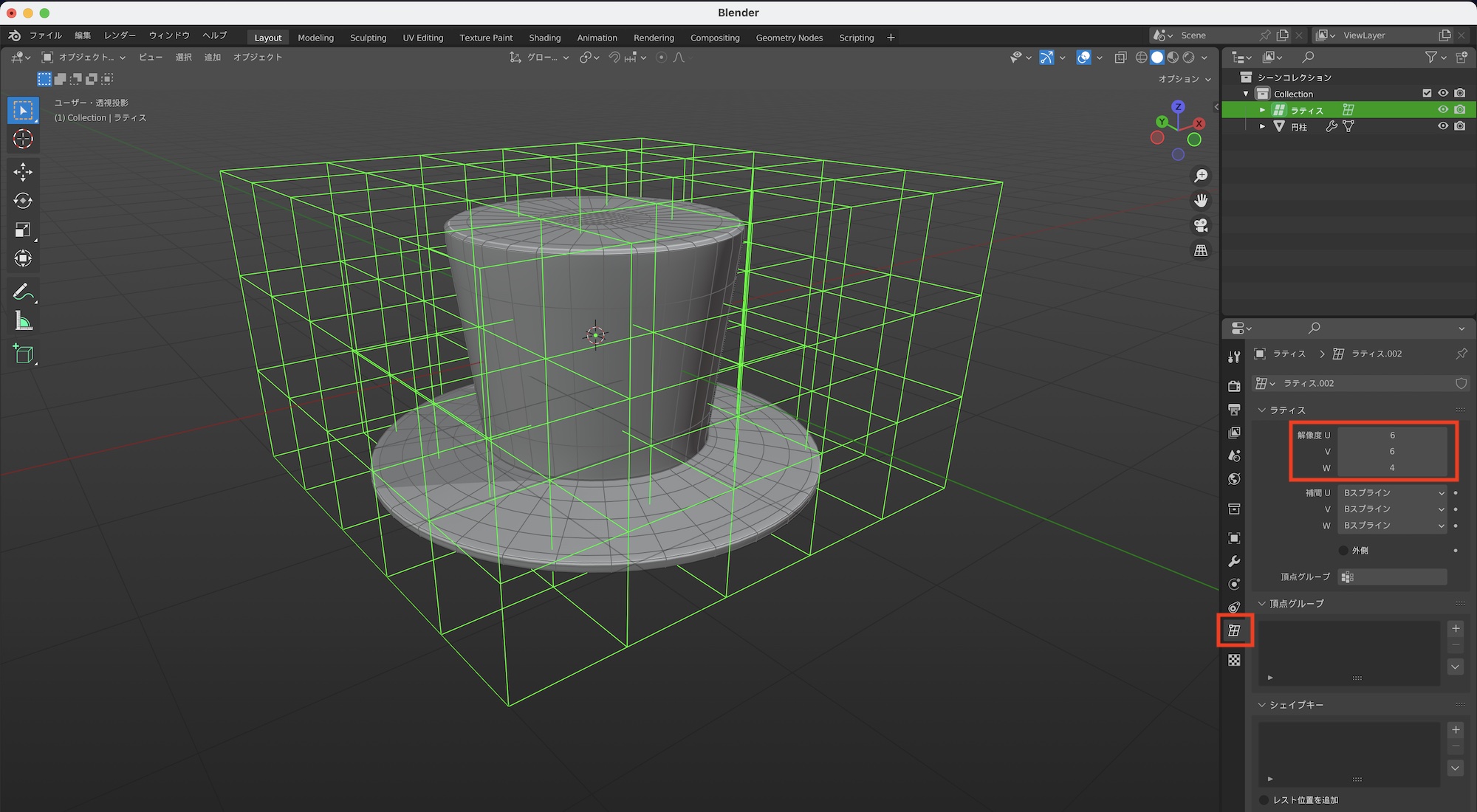 次にラティスオブジェクトが選択された上で、プロパティの「ラティス」の項目に移り、「解像度: UVW」の項目から分割数を指定します。今回は調整する頂点はそこまで多くないので、解像度UとVを「6」、Wを「4」にしています。