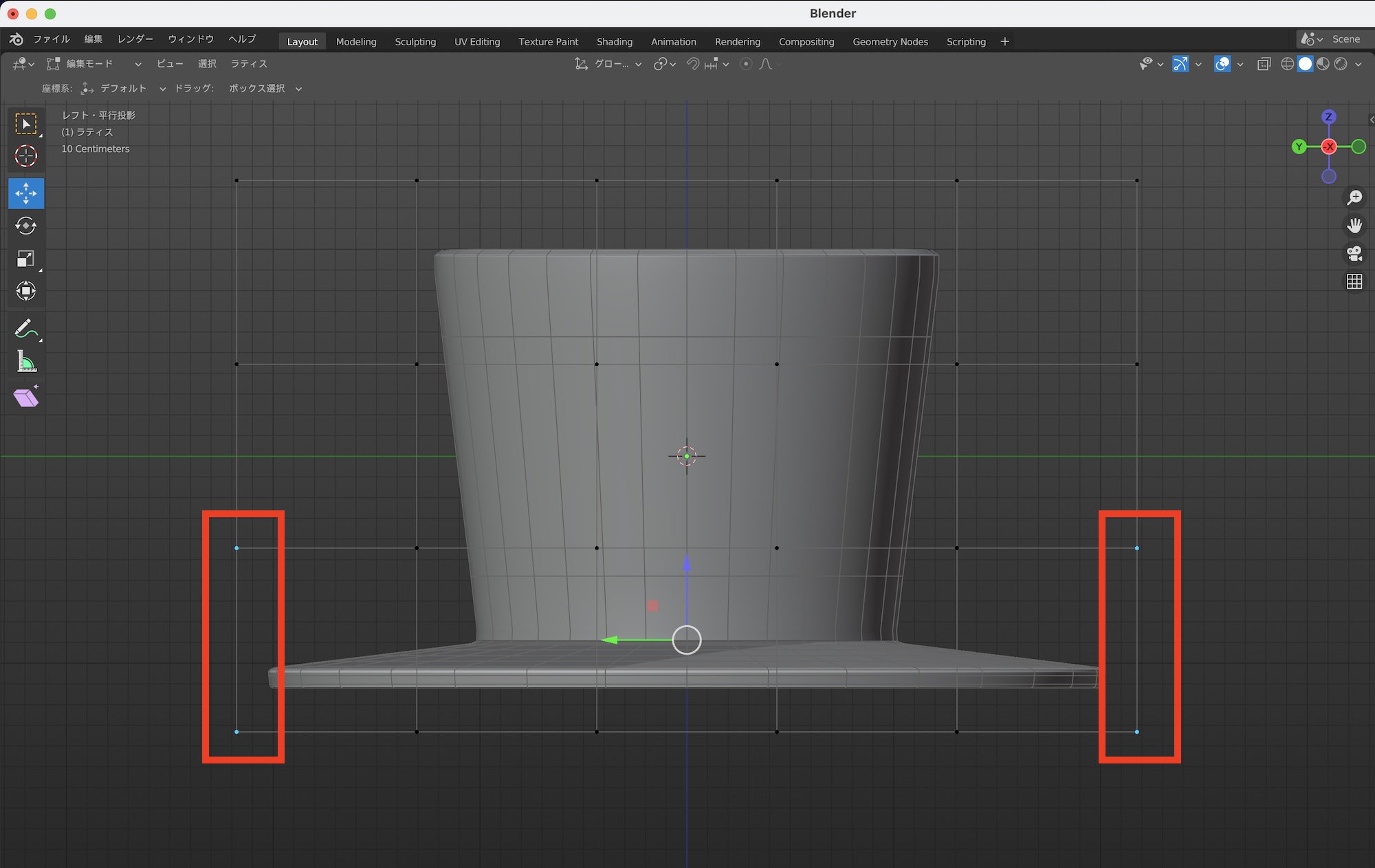 位置ツールを用いて頂点を動かすことも可能ではあるものの、別のシーンで使う可能性があったり、メッシュを必要以上に変形させたくないので、ラティスモディファイアーを適用していきます。