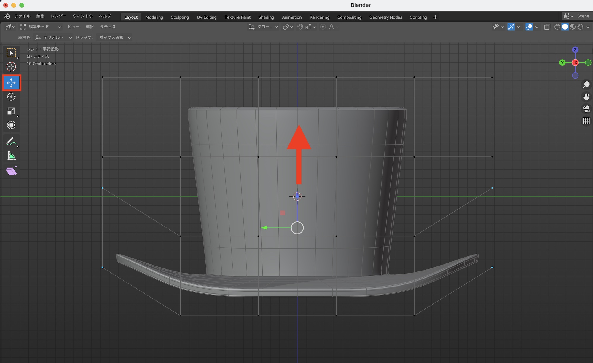 上の帽子のメッシュを例にしてみましょう。左右のつばのみに丸みを加えたいので、左右にある頂点を選択し、移動ツールを使って上方向に動かしてつばの部分を持ち上げます。