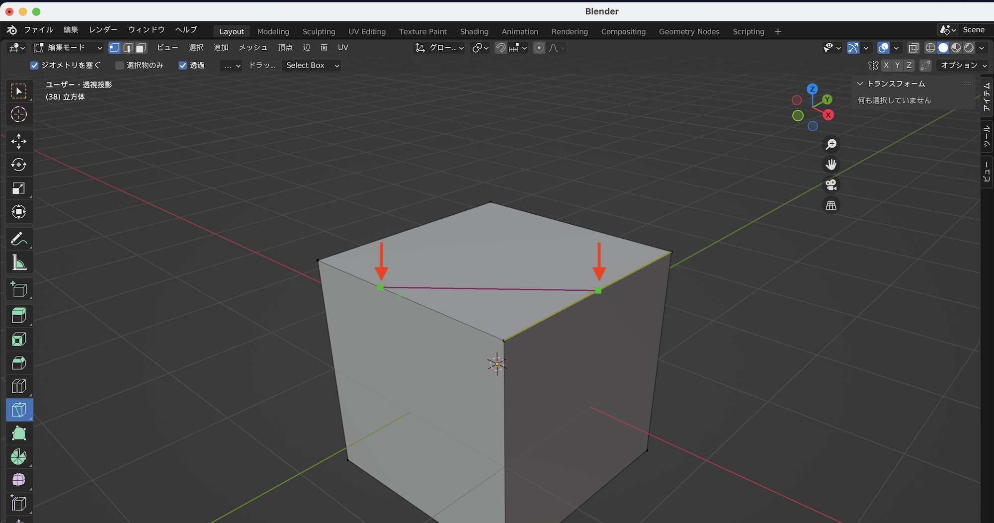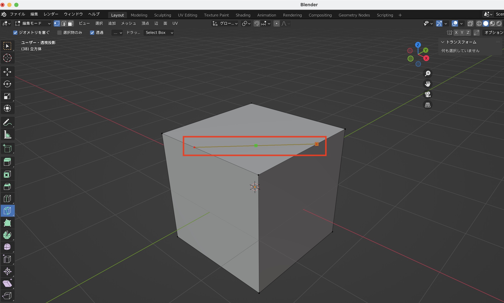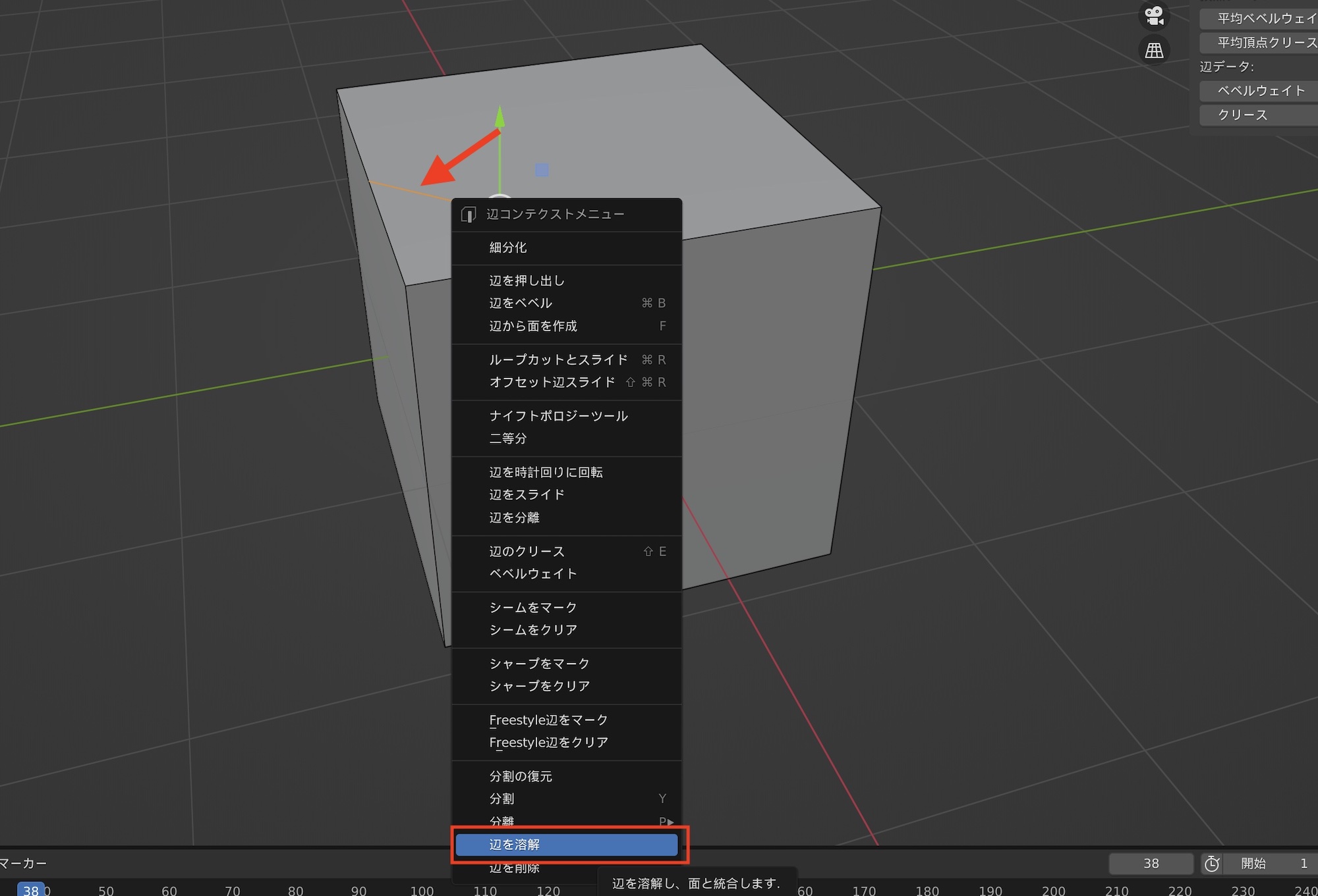 間違ってカットを行ったり、不要な辺や頂点を削除したい場合は辺のモードにした上で、取り除きたい辺を選択して右クリック「辺を溶解(Dissolve Edges)」をクリックすると選択した辺が削除されます。
