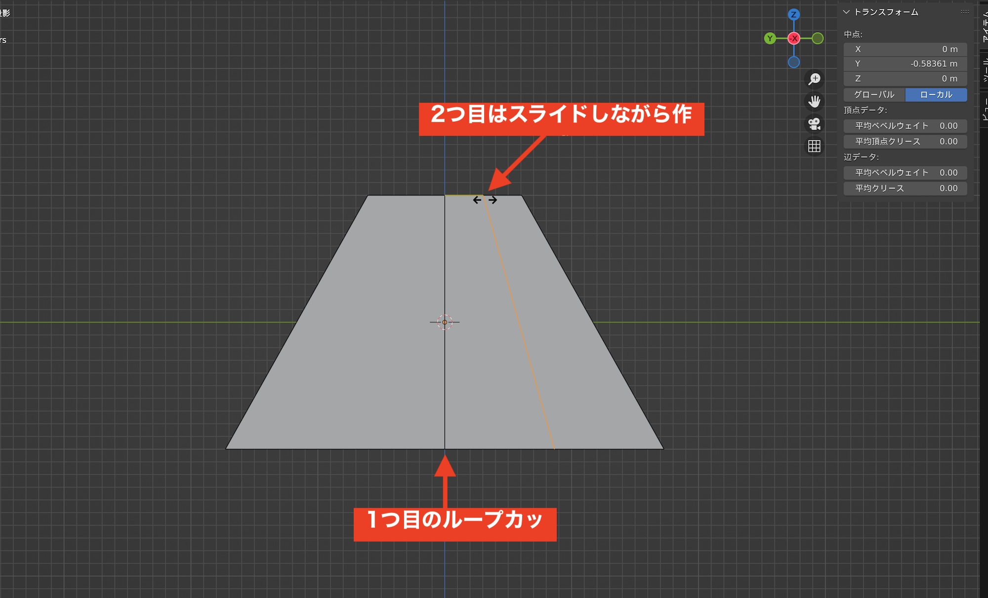 ループカットはデフォルトではオブジェクトの中心にスナップされますが、好きな位置にカットしたい場合はループカットにした上で長めにクリックしながらドラッグするとスライドしてカットが行えるようになります。より細かく動かしたい場合は「Shift」キーを押しながらスライドすると良いでしょう。
