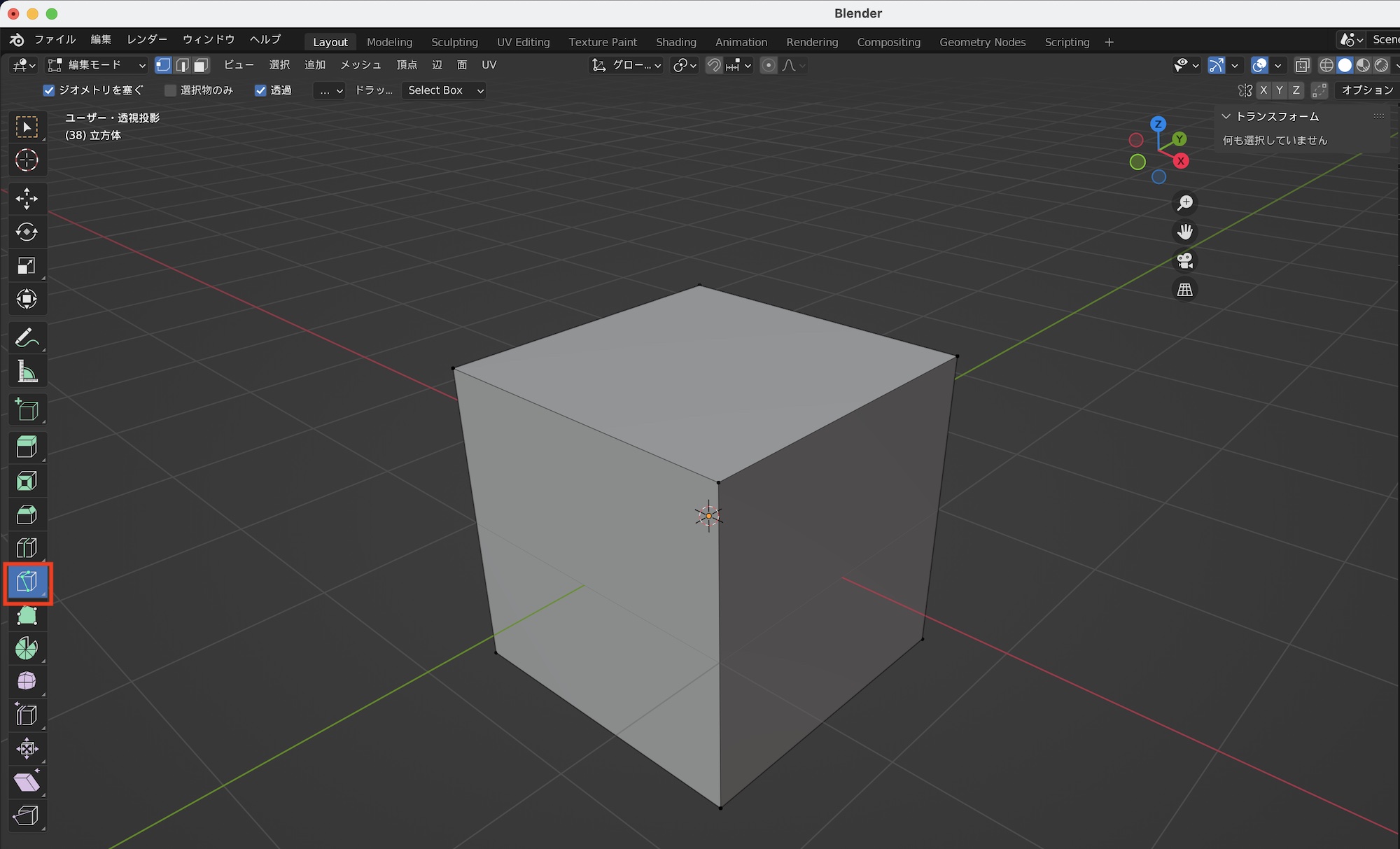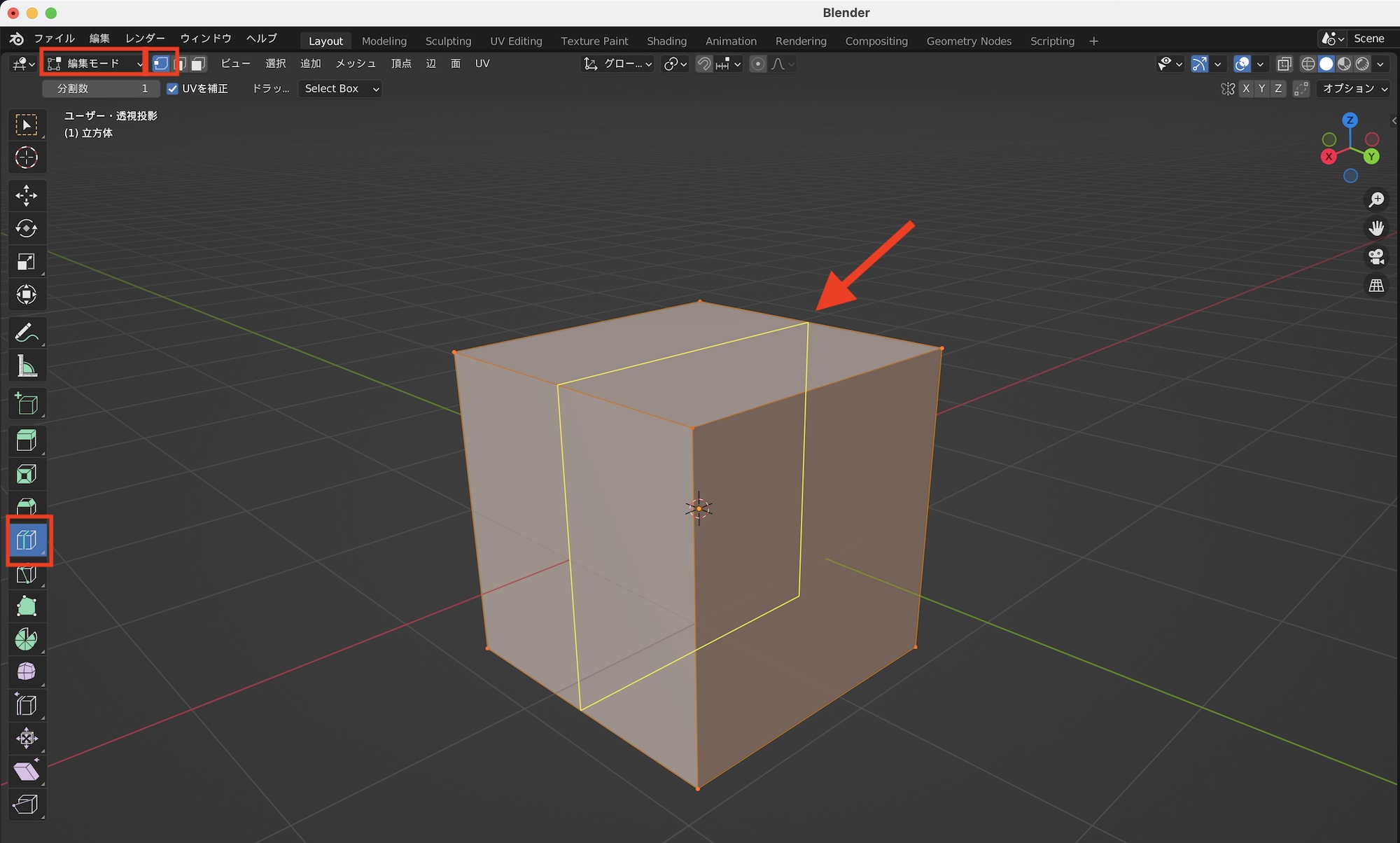 ループは行わずに一部の面をカットする場合はナイフツールを使用します。左側のツールからナイフツールを選択するか、ショートカットキー「K」を使ってツールを有効化します。