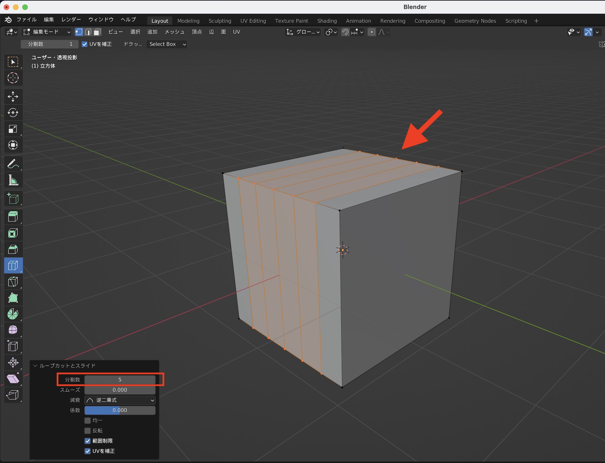 左下に現れるオプションにある「分割数」からループカットの数を指定できます。「5」にするとカットが5個追加され、6つのポリゴンを作成できました。