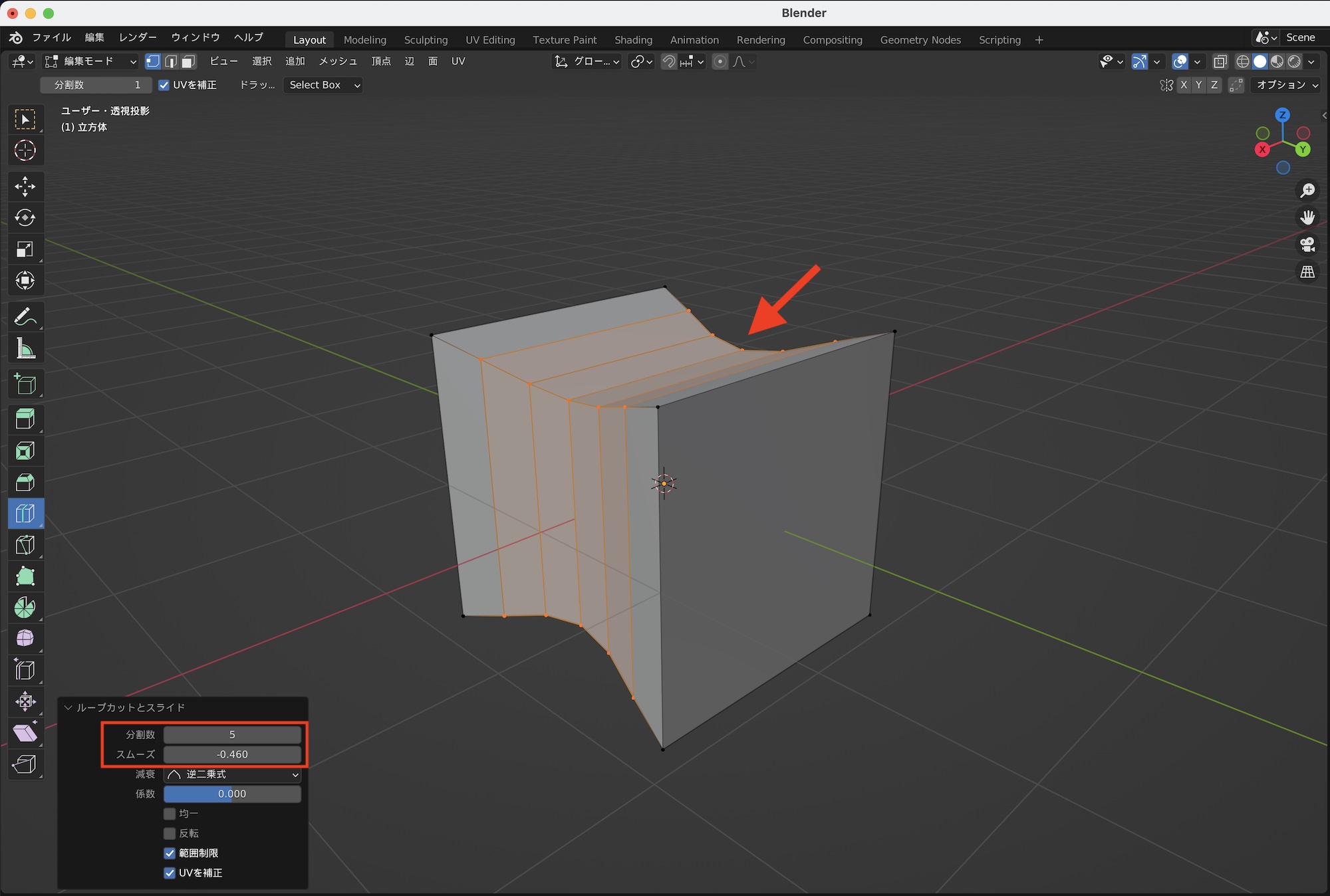 「スムーズ」と「減衰」の項目ではループカットの際に作成された面の滑らかさを設定します。カーブ状に変形できるので便利ですが、この操作はスケールを使っても同じ表現を行えるので、そこまで気にしなくて良いと思います。全てのカットが完了したらビューポートをクリックしてカットを完了させると良いでしょう。