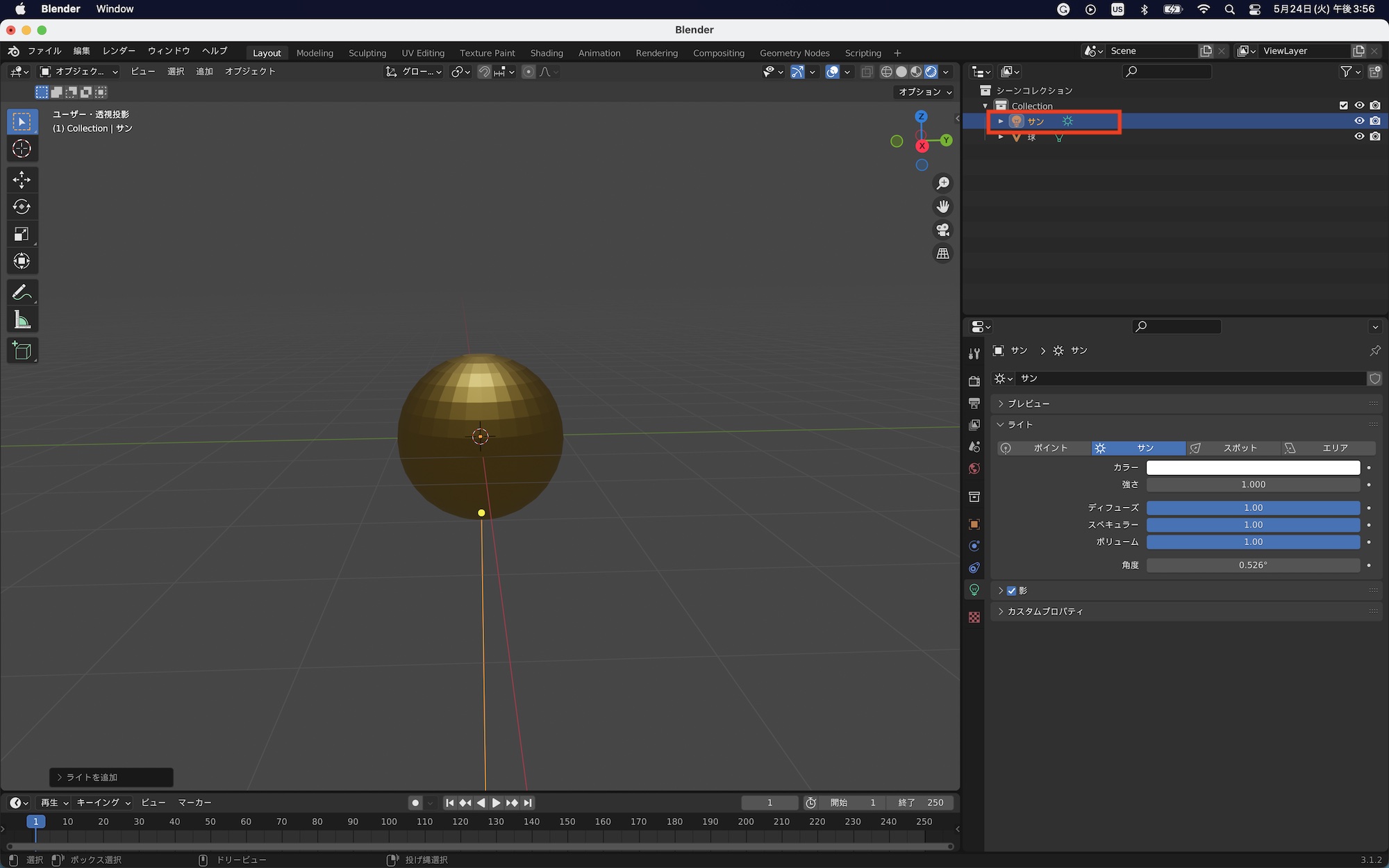 レンダープレビュー時にオブジェクトのマテリアルを確認できない場合は、ライトオブジェクトまたはHDRIなどの照明を追加する必要があります。下の例ではサンオブジェクトを追加したもの。