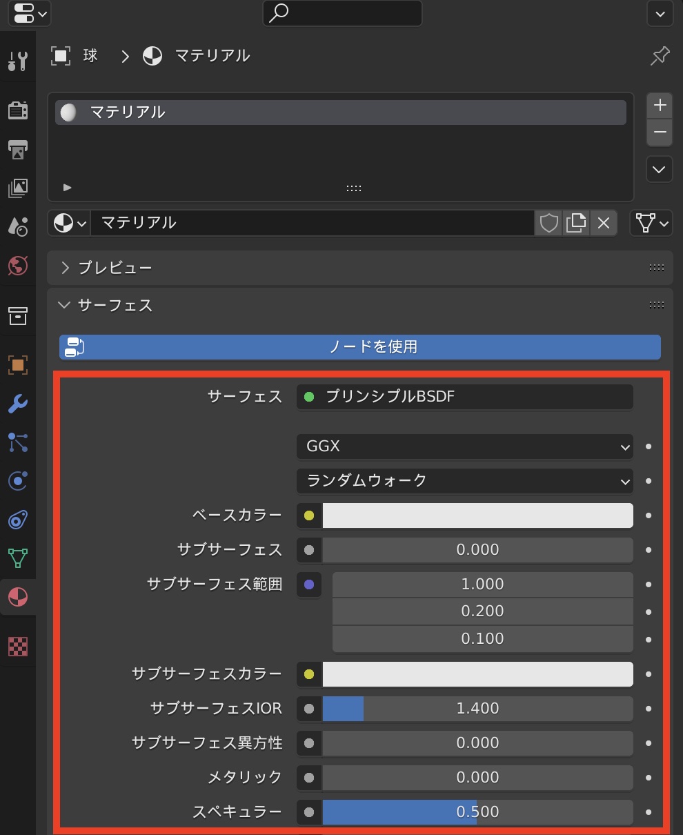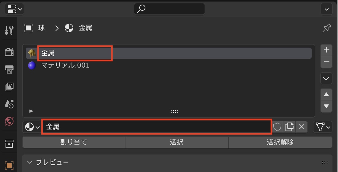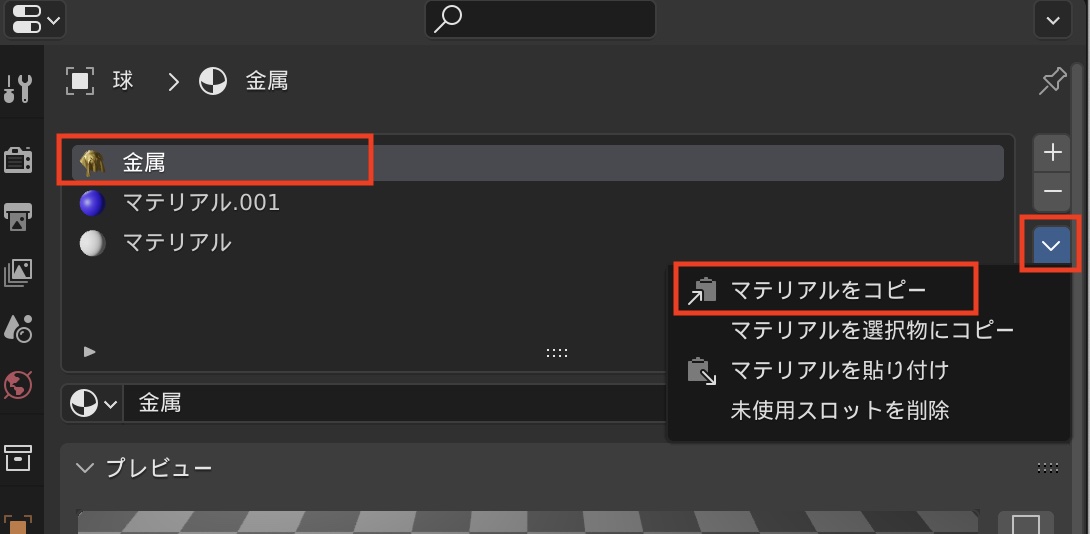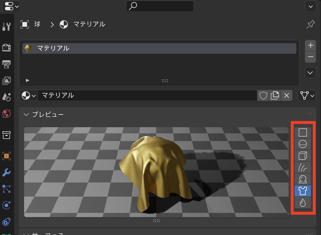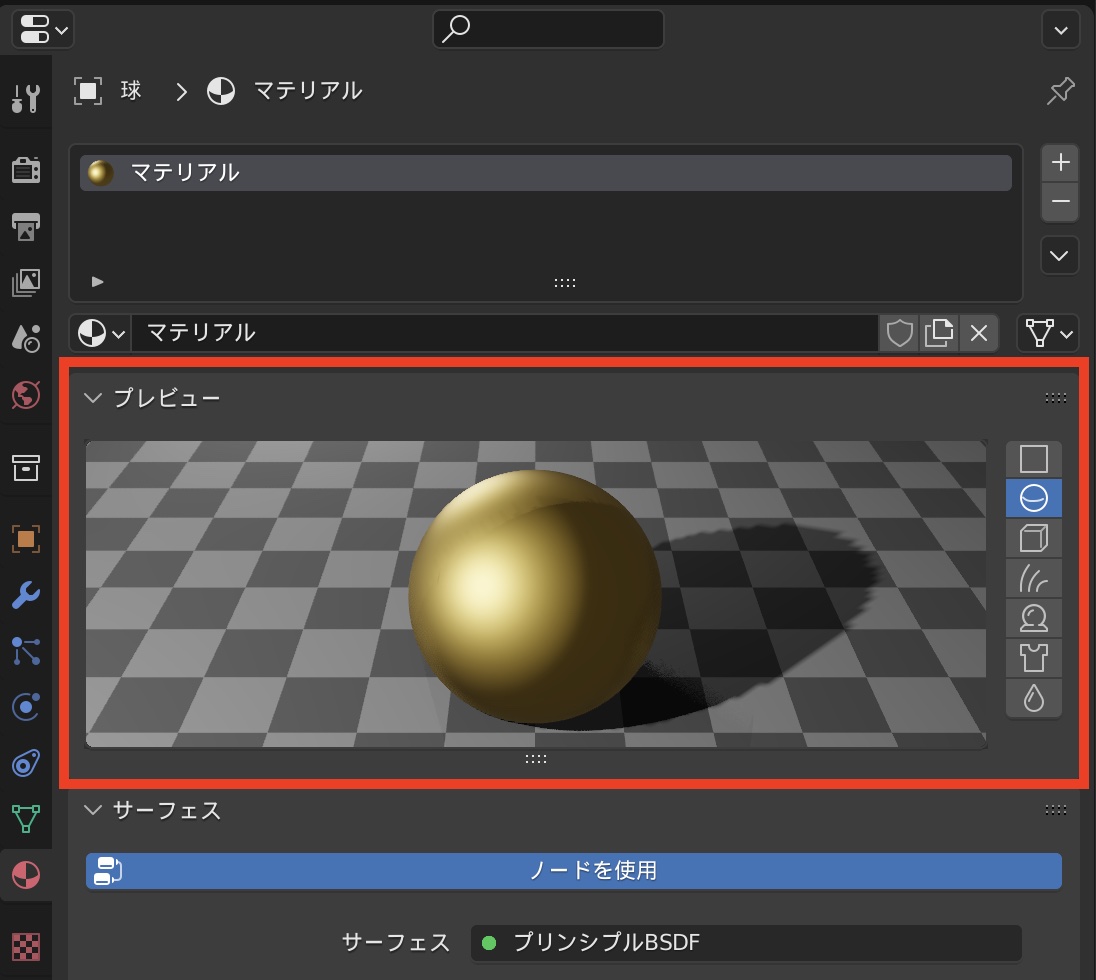 マテリアルの効果はビューポート上でも確認できますが、マテリアルプロパティにある「プレビュー」の項目からも確認ができます。