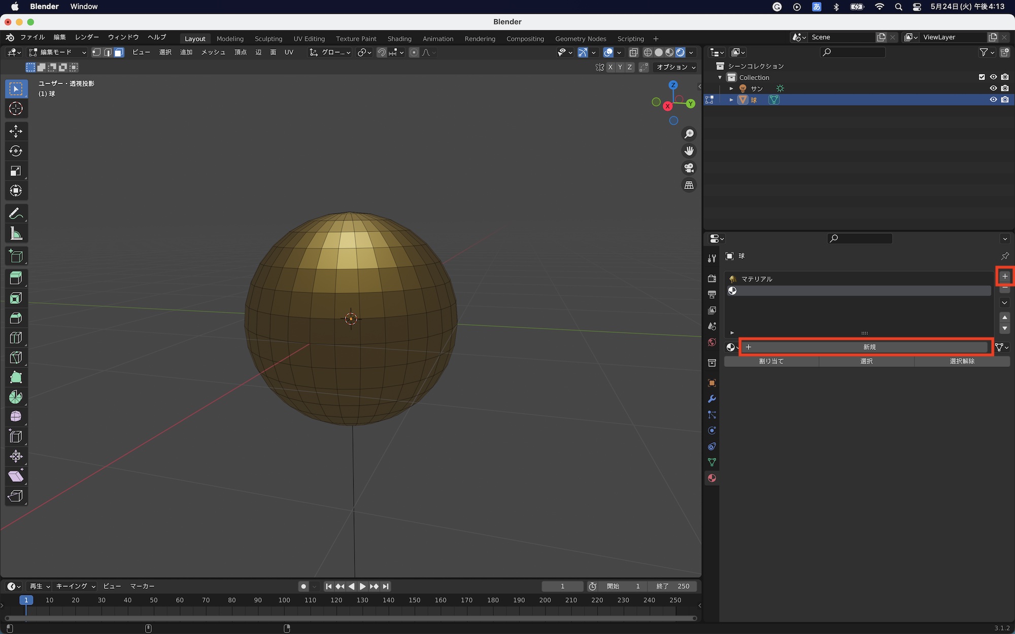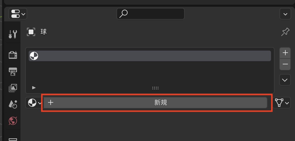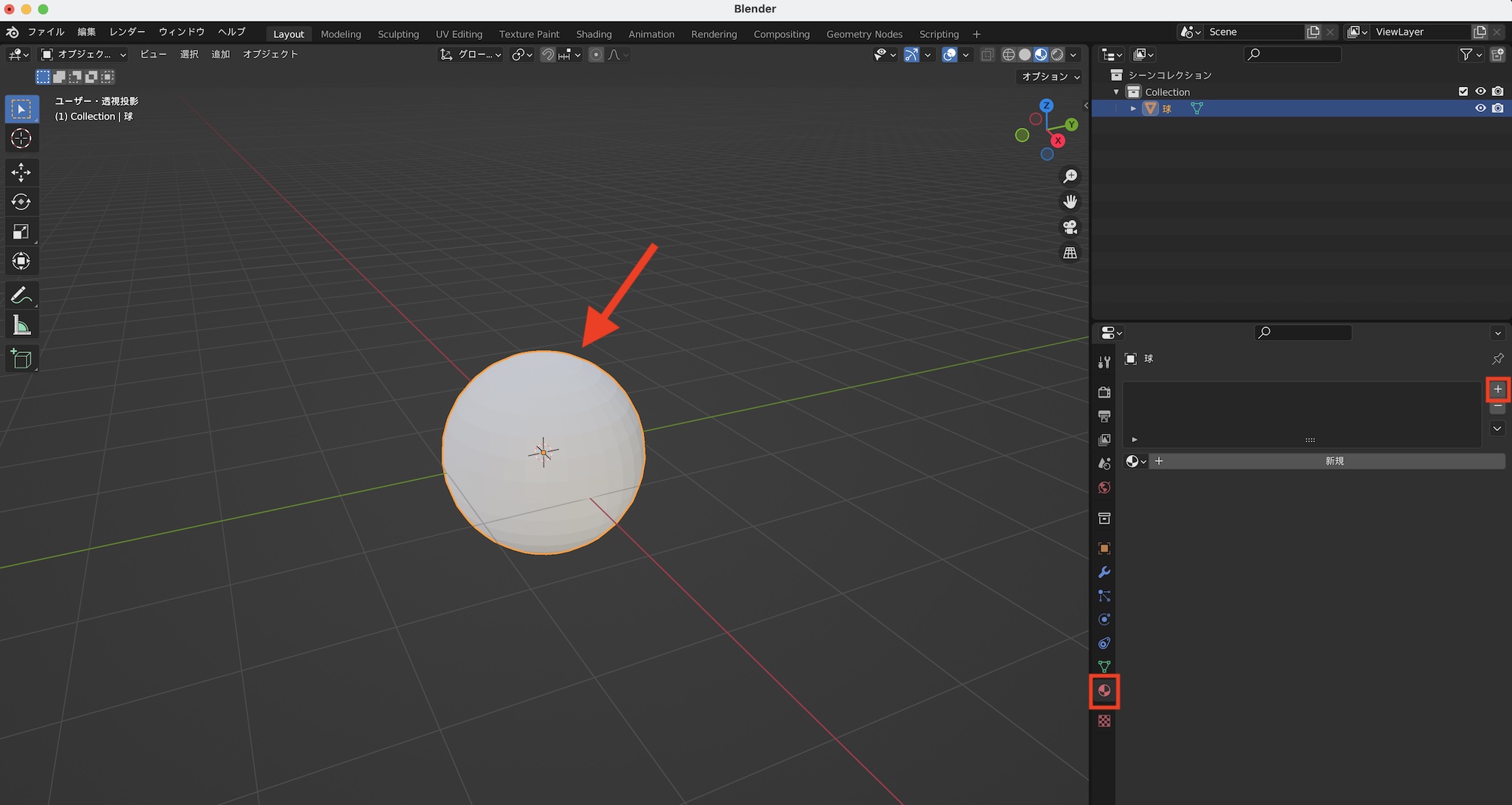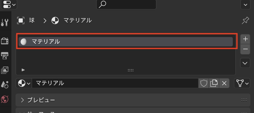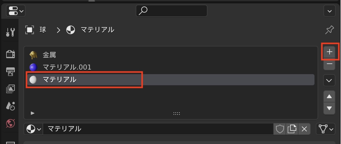 球体を選択した状態でマテリアルプロパティを開くとマテリアルがまだ何も反映されていない状態なので、右にある「+」アイコンをクリックしてマテリアルスロットを追加します。
