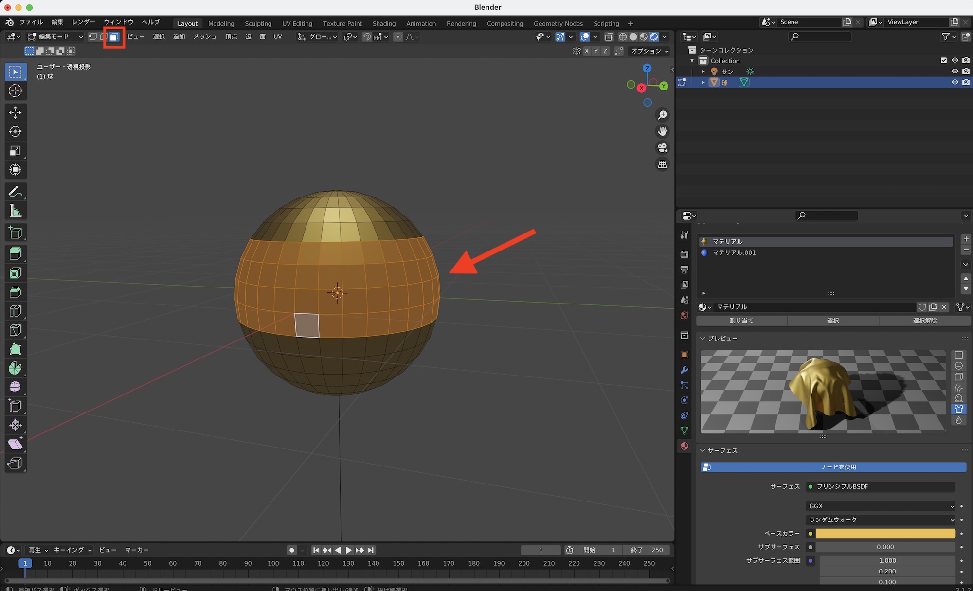 面選択モードに切り替えて、2つ目のマテリアルを反映させたい面を選択していきましょう。