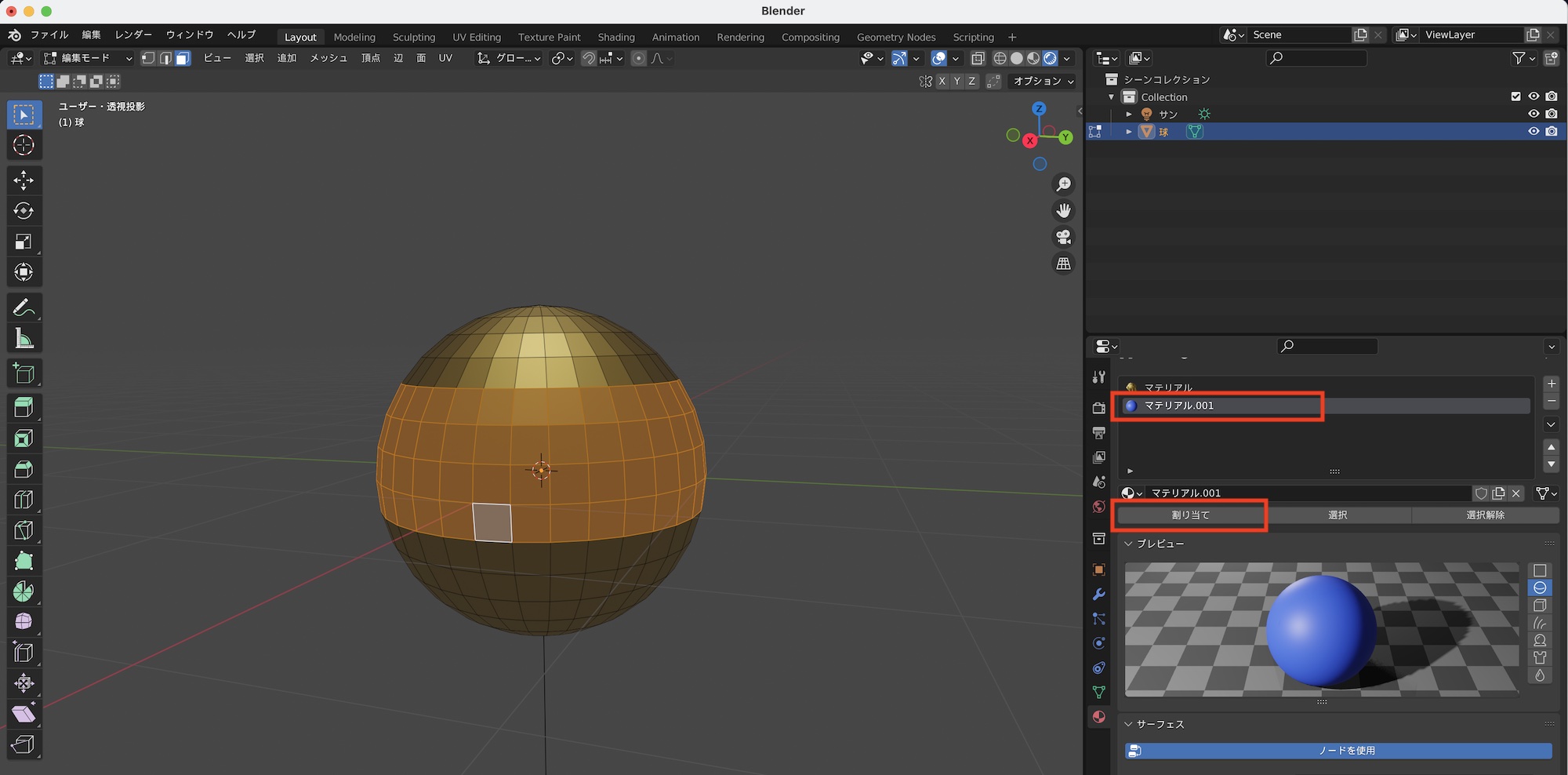 編集モードでのマテリアルの操作はオブジェクトモードの時と同じですが、面(ポリゴン)ごとに違うマテリアルを適用できます。