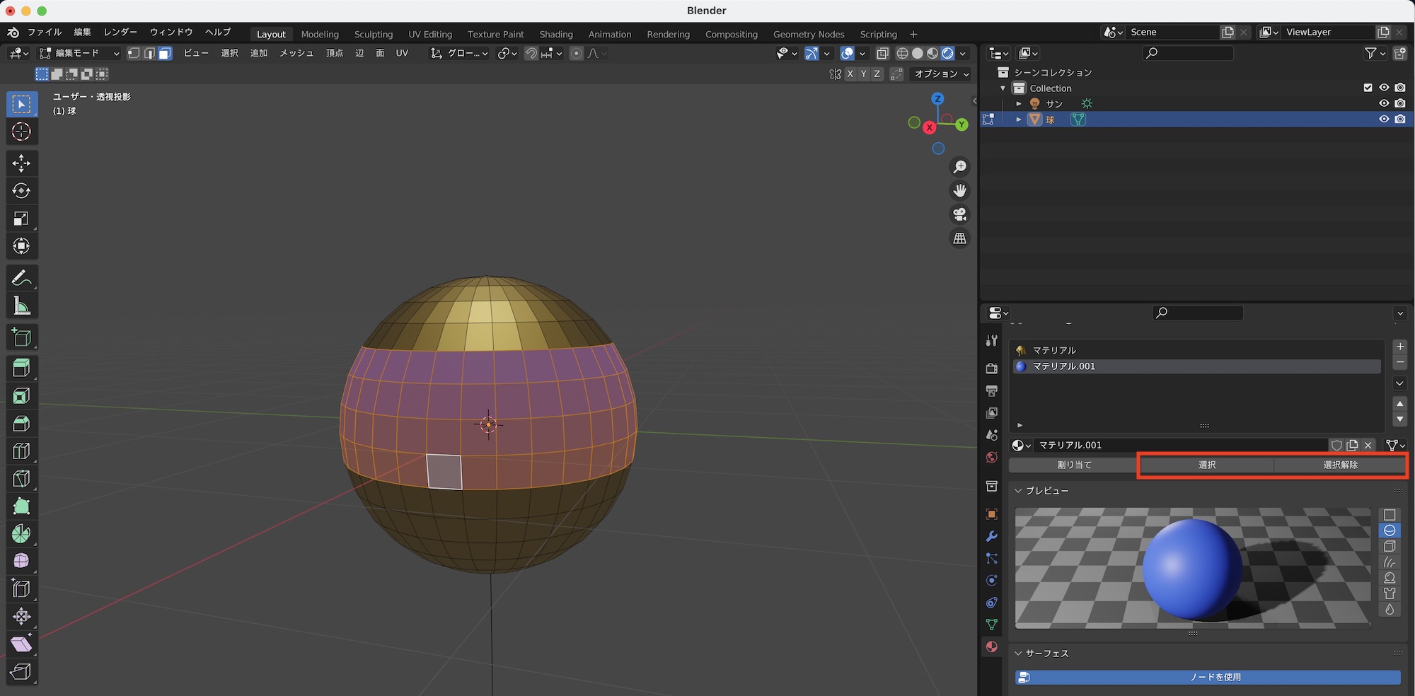 編集モードでの操作: 指定した面へのマテリアル追加