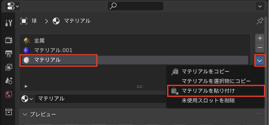 次に複製先のマテリアルを選択して、同じように矢印アイコンの「マテリアルを貼り付け」をクリックして複製します。