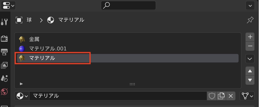 Blenderでマテリアルを追加するには右側にある「マテリアルプロパティ(Material Properties)」から操作します。