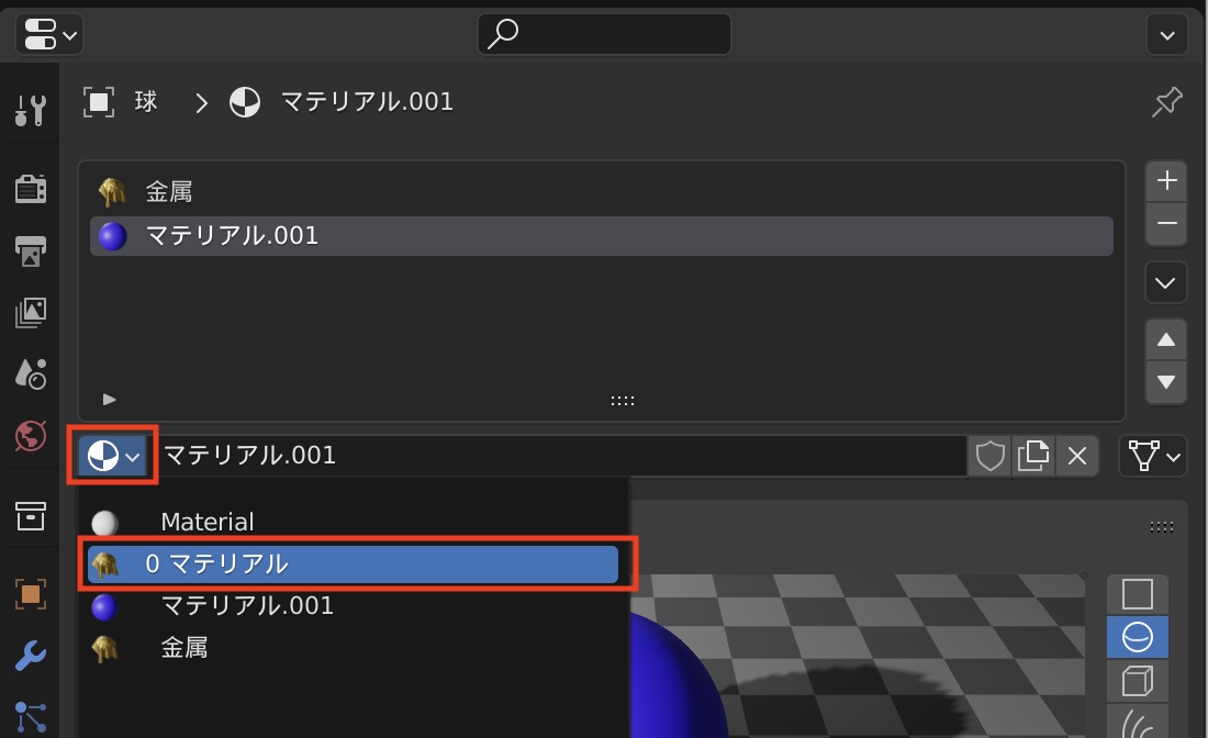 マテリアルスロットからは削除されましたが、「リンクするマテリアルを閲覧」のアイコンをクリックすると、マテリアルそのものはまだ残った状態です。