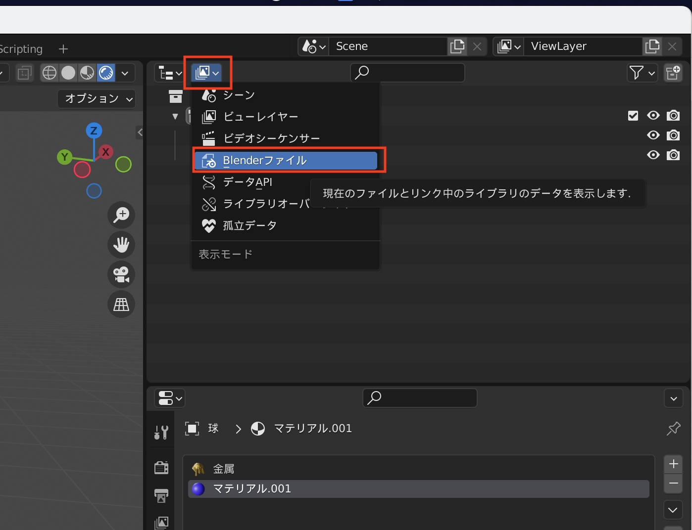 アウトライナー上部にある「表示モード」のドロップダウンメニューをクリックし「Blenderファイル」に切り換えます。