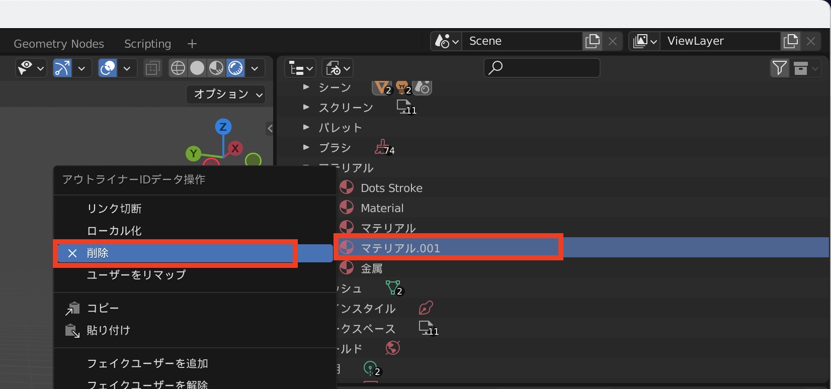 作成したマテリアルを完全に削除する場合はマテリアルスロット、マテリアルの順番で削除する必要があります。