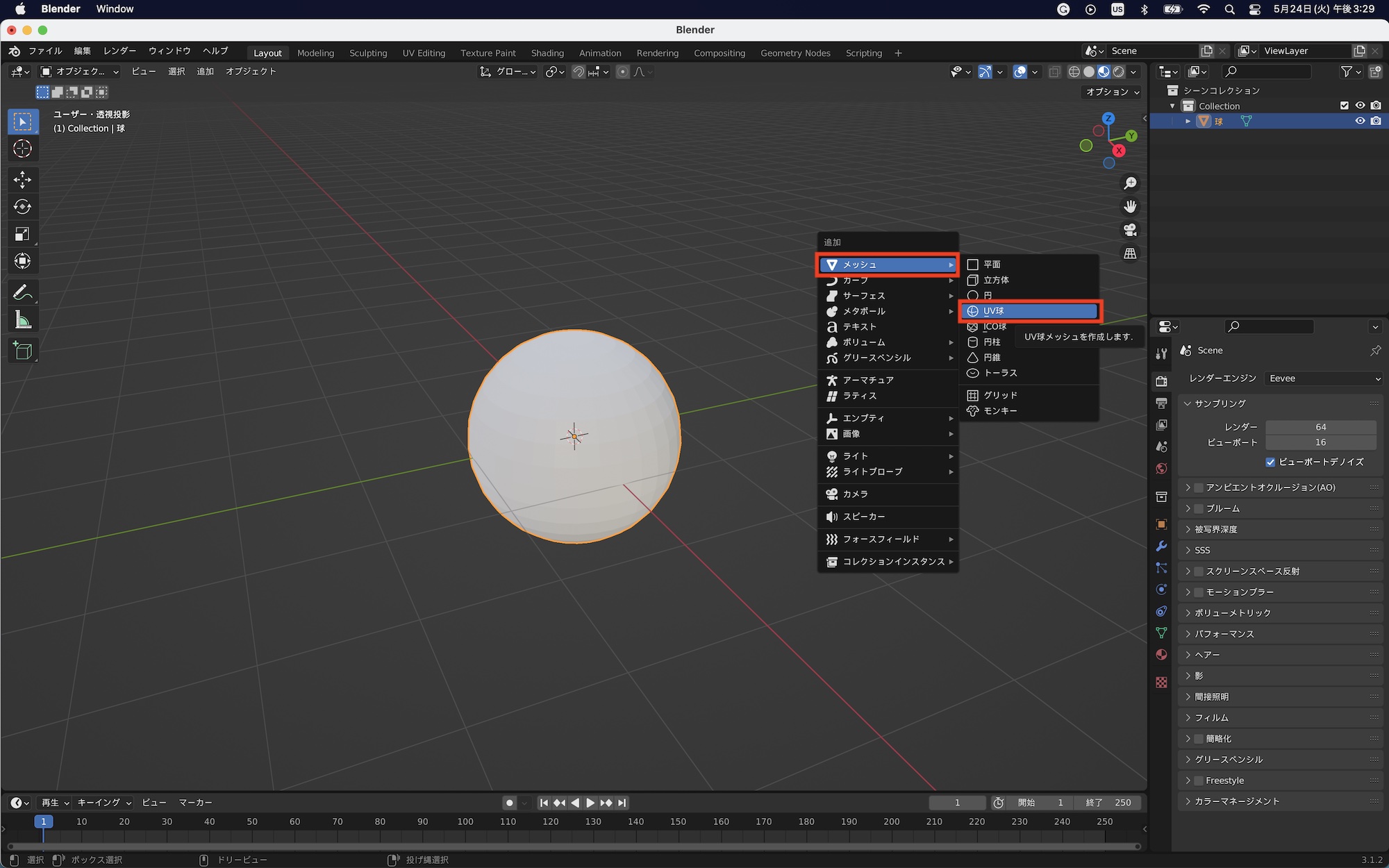 まずはオブジェクトモードの状態でマテリアルを操作してみましょう。デフォルトで用意されていたオブジェクトを全て削除し、今回はビューポートにUV球を追加しました。