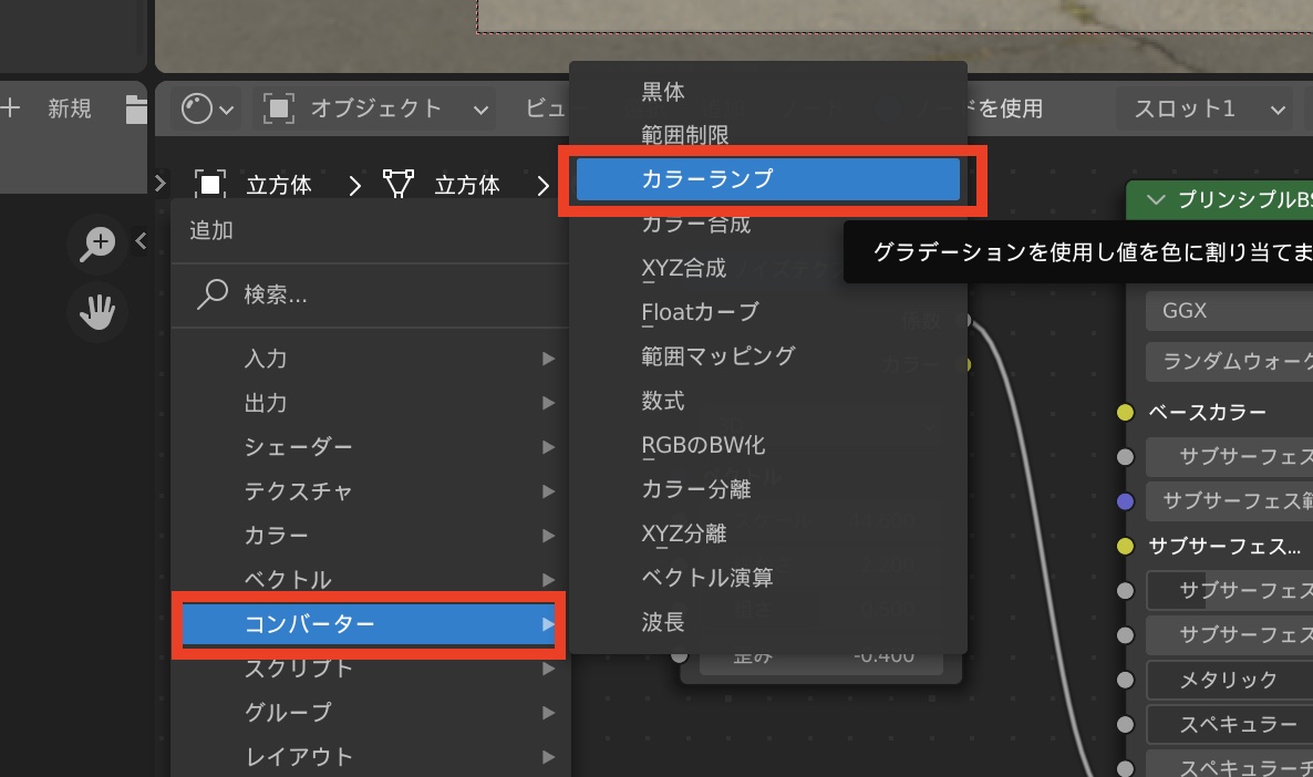 「Shift + A」または「追加」から「コンバーター」の中にある「カラーランプ」を追加します。