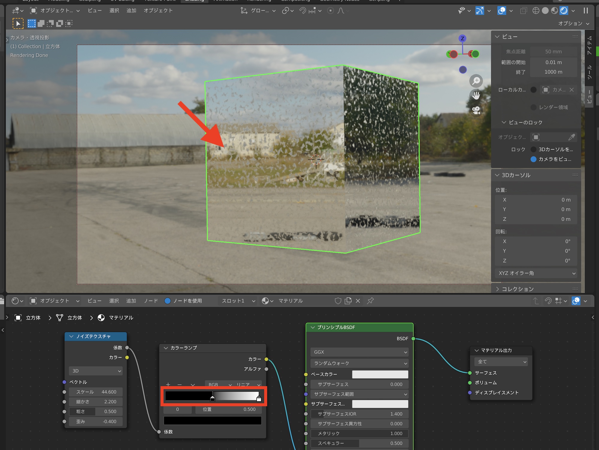 カラーランプノードのグラデーション部分を操作することで、ノイズテクスチャによる粗さの強度を調整できます。黒色は反射する部分となるので、カラーランプの黒色を動かすことにより、反射する範囲を広くすることができます。