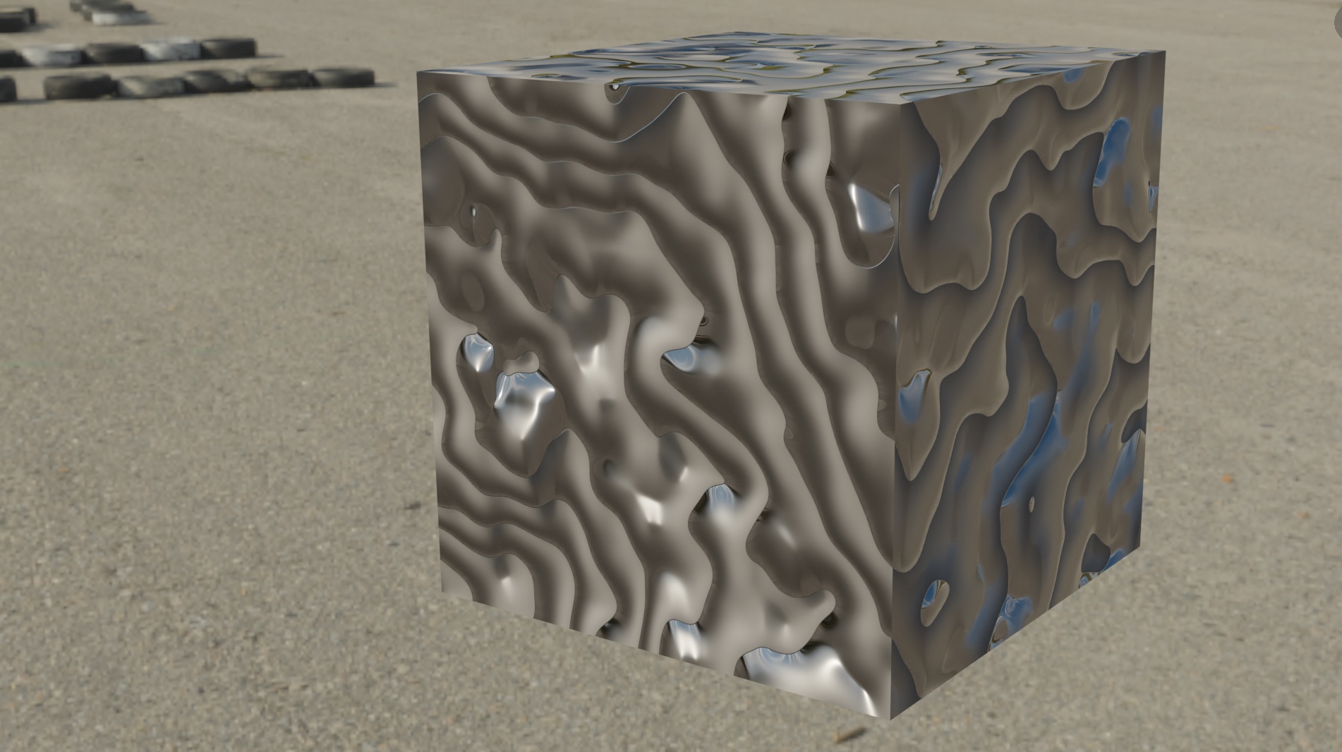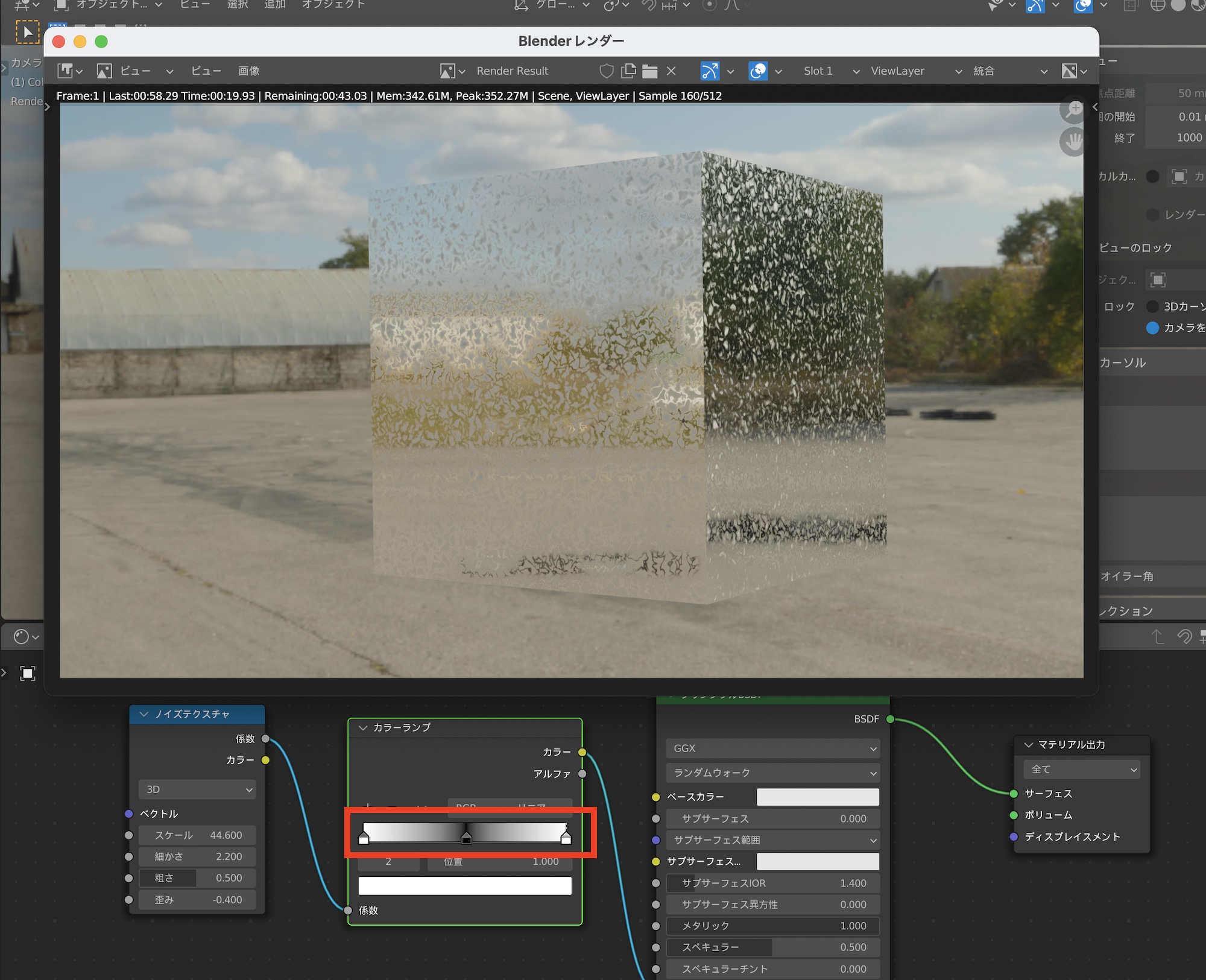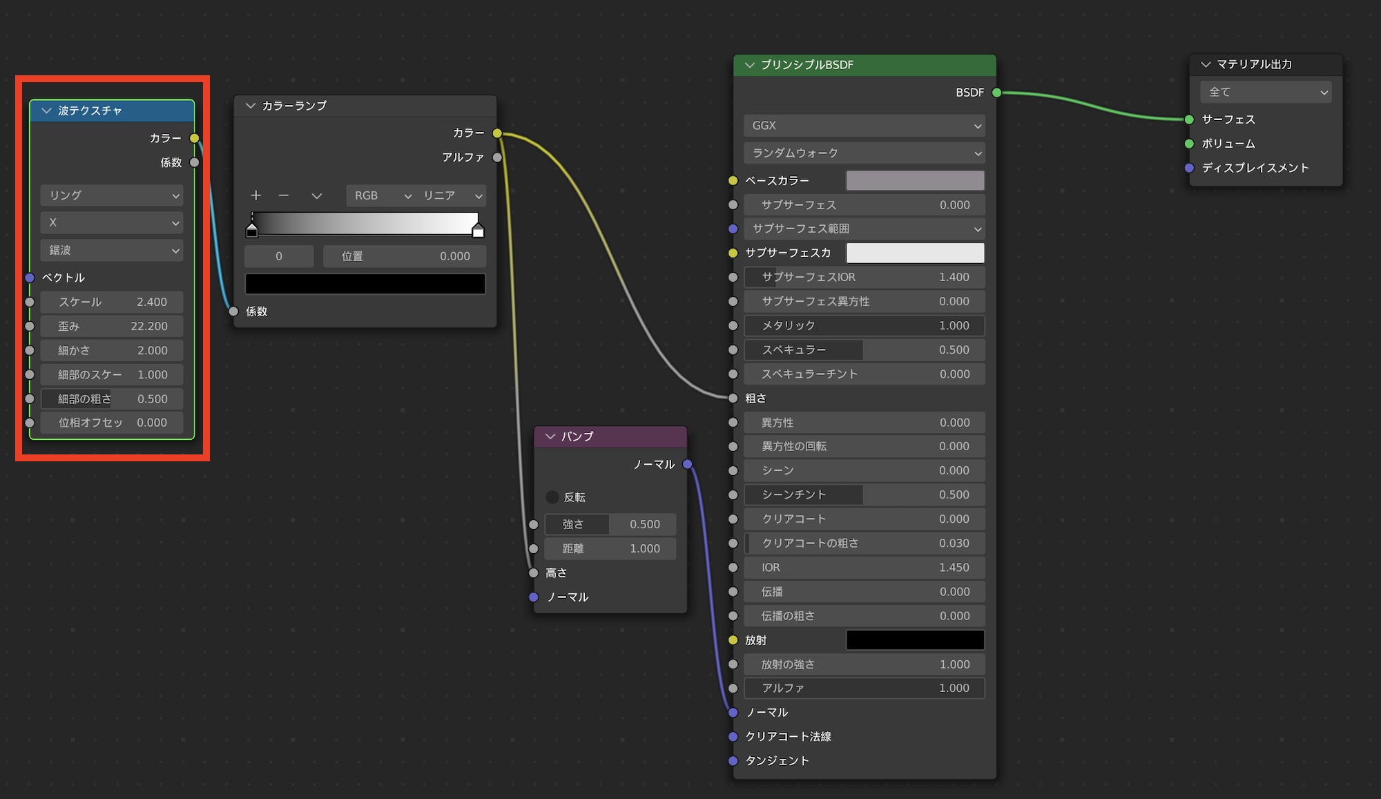 上の画像では「波テクスチャ」をプリンシプルBSDFの粗さとバンプマップに接続したもの。立方体の表面が波模様になりました。
