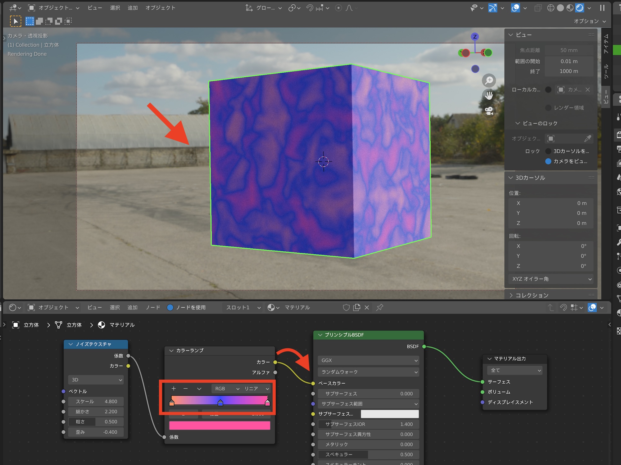 反射や透過といった場合は基本的にグレーを含む、黒と白の色のみを指定しますが、カラーランプの「カラー」をプリンシプルBSDFの「ベースカラー」に接続すると、カラーランプのグラーデーションとノイズの出力で、色を組み合わせた模様を作成できます。