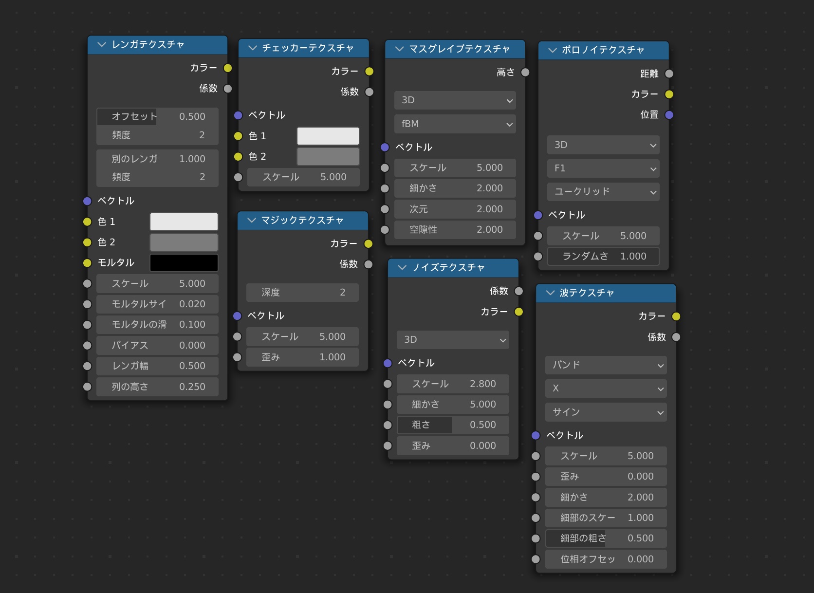 各テクスチャの詳細については説明を省きますが、ノイズテクスチャ同様にパラメータが用意されているので、サイズや歪みなどを調整することができます。