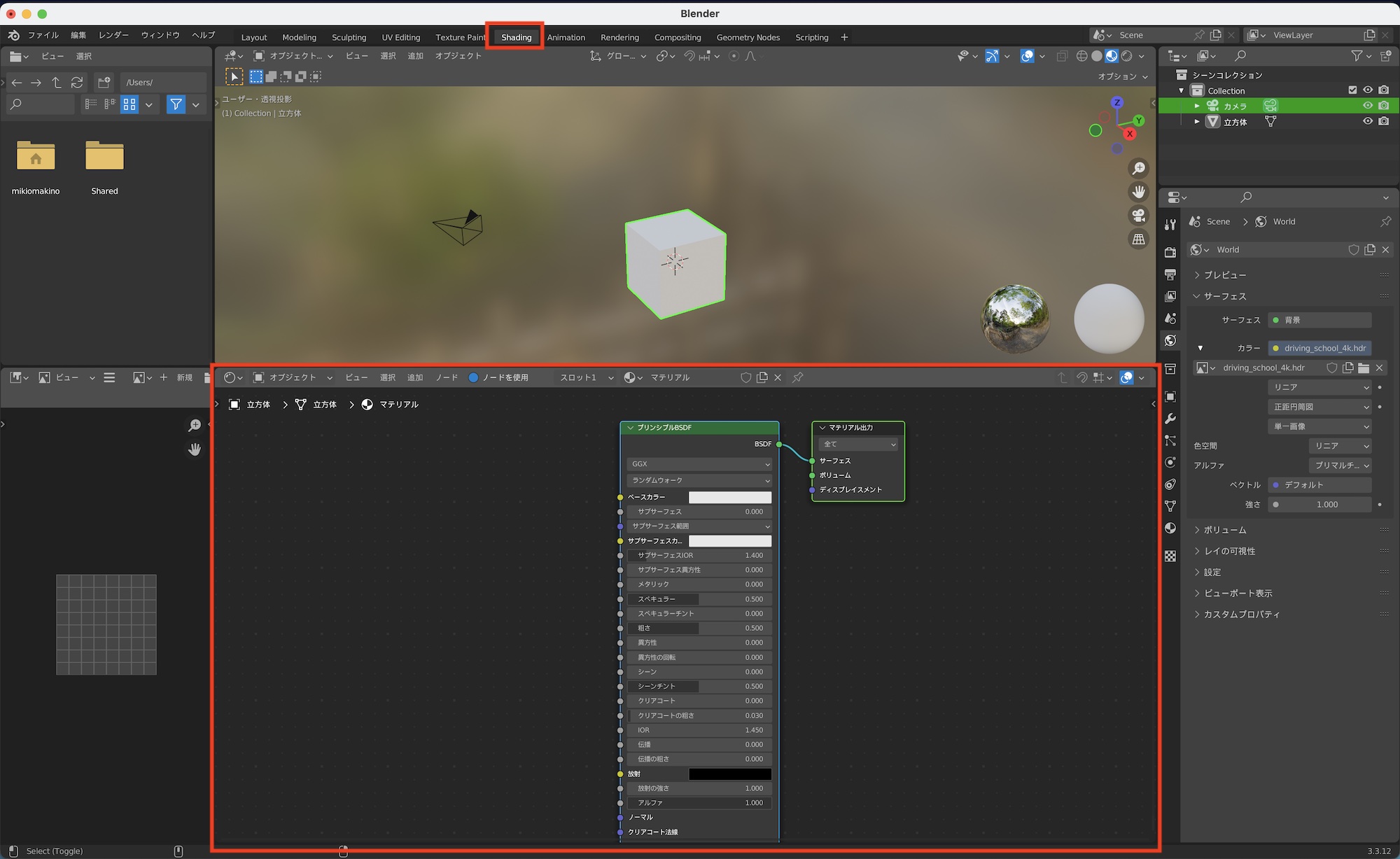 マテリアルを適用したら。上部の「Shading(シェーディング)」をクリックしてワークスペースを変更し、シェーダーエディターの項目を表示します。