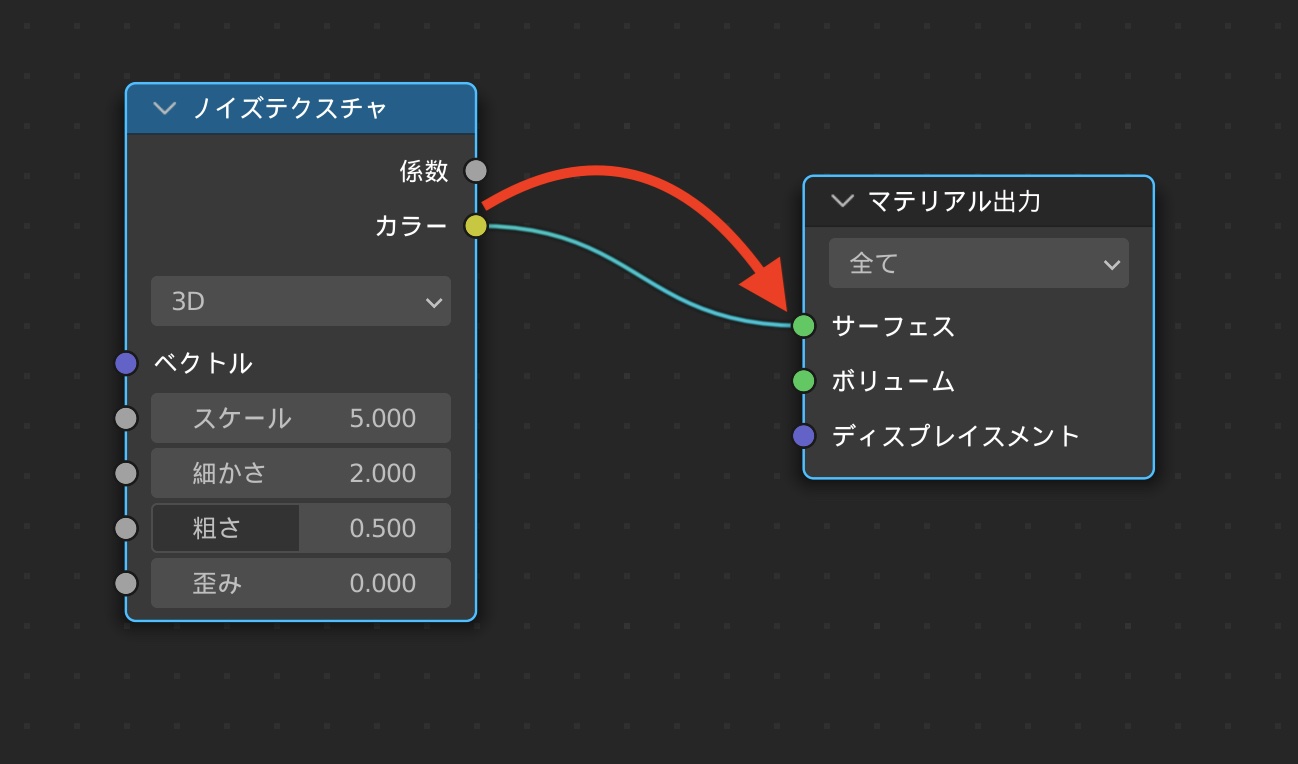 ノイズの効果を確認するため、ノイズテクスチャの「カラー」をマテリアル出力の「サーフェス」に接続します。