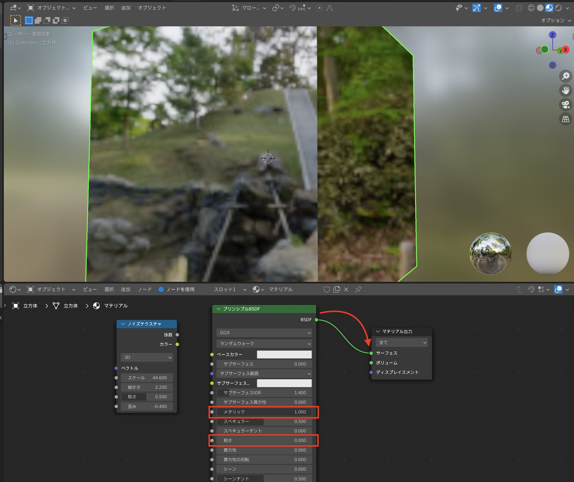 先ほど作成した立方体のマテリアル出力とプリンシプルBSDFを接続し、「メタリック」を「1」、「粗さ」を「0」にして金属のマテリアルにしてみます。