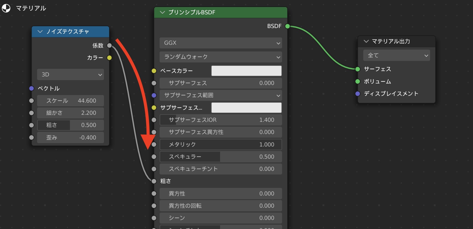 ノイズテクスチャの「係数」をカラーランプの「係数」に接続し、右側の「カラー」をプリンシプルBSDFの「粗さ」に接続します。