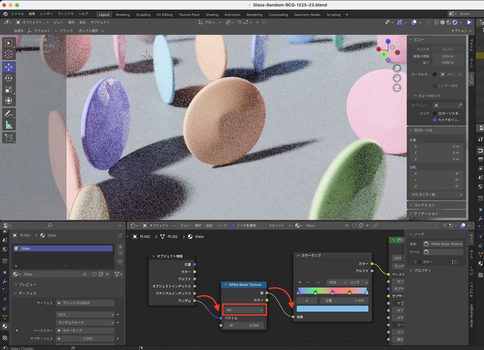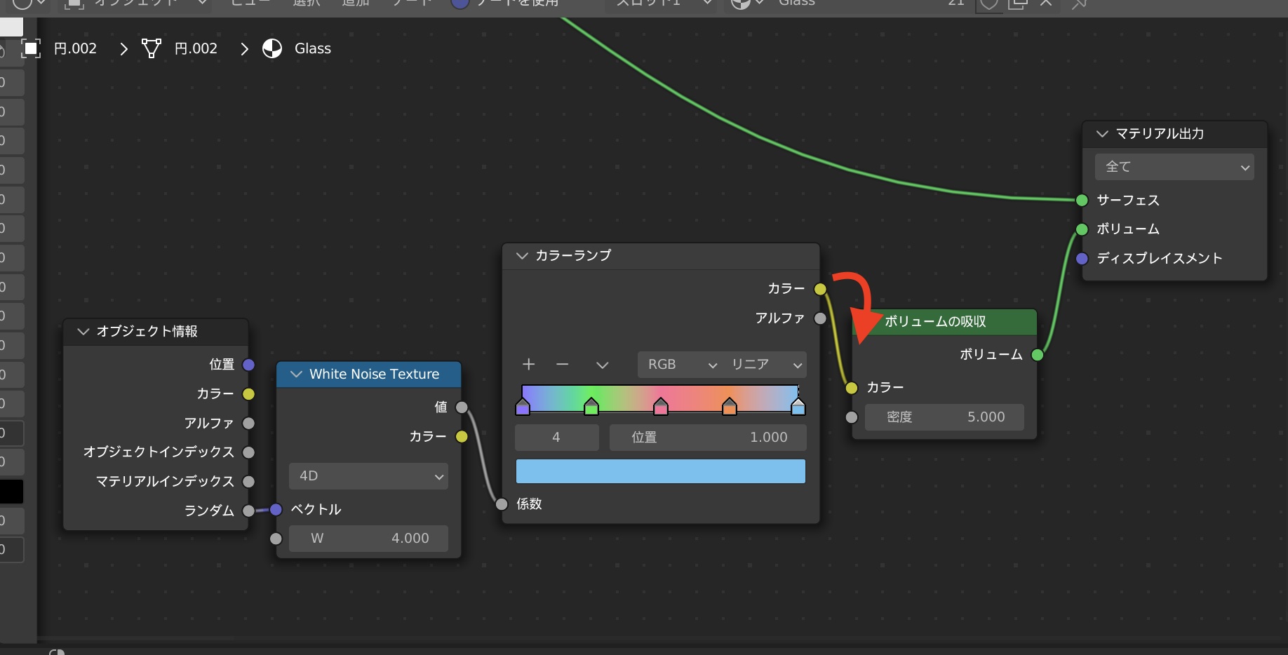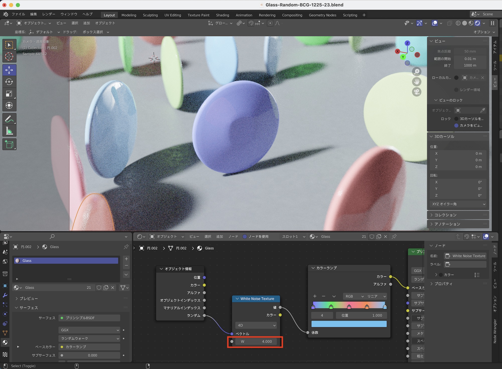 その後でオブジェクト情報、ホワイトノイズ、カラーランプのノード群を上の画像のようにボリュームの吸収の「カラー」に接続すると、ガラスのマテリアルにもランダムの色が適用されるようになります。