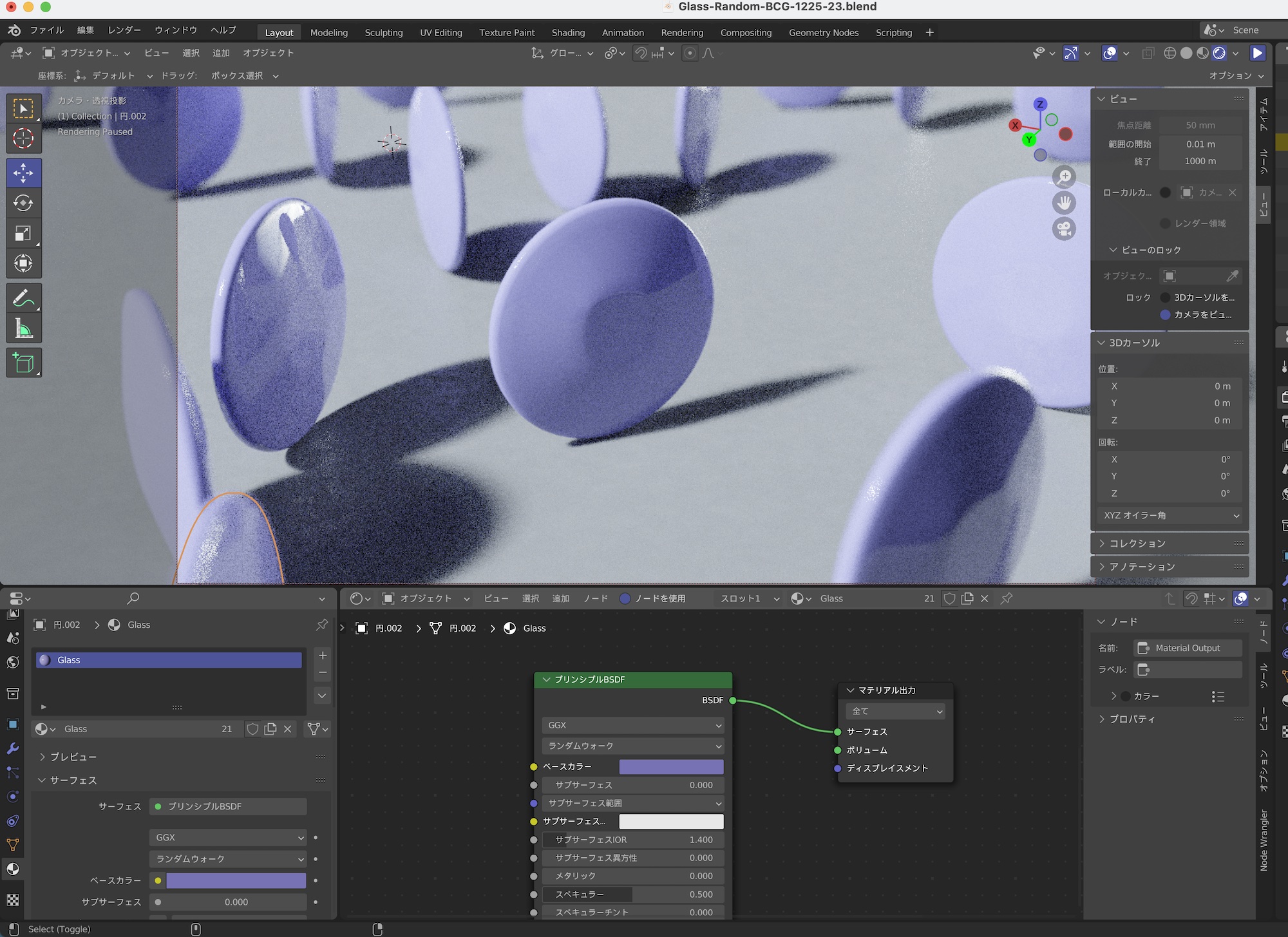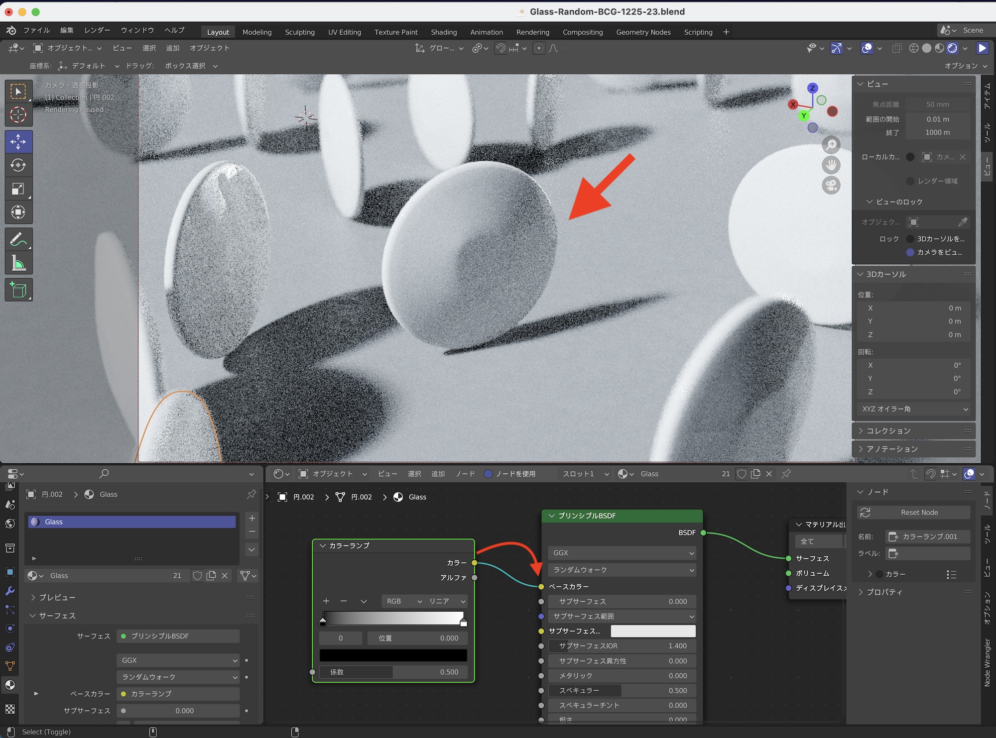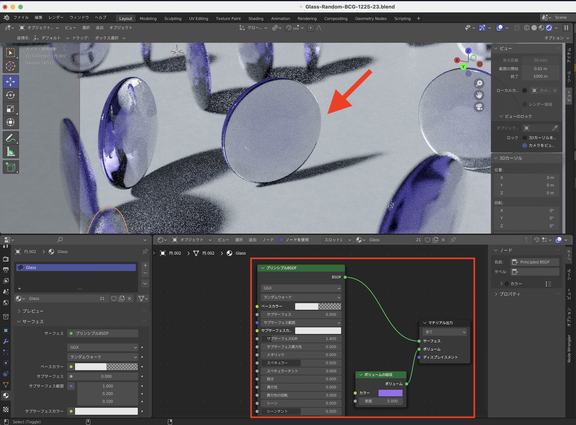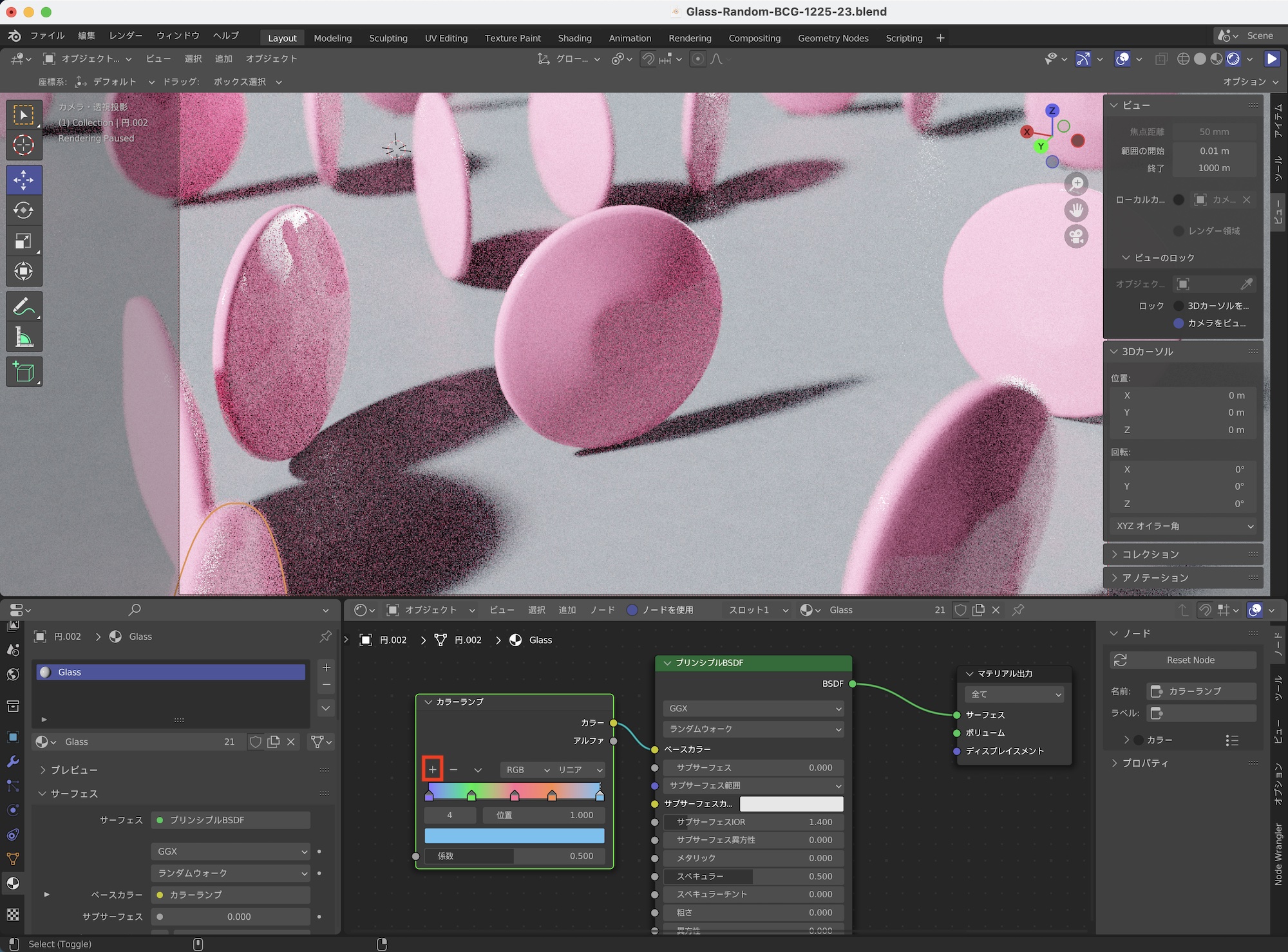 その後でオブジェクト情報、ホワイトノイズ、カラーランプのノード群を上の画像のようにボリュームの吸収の「カラー」に接続すると、ガラスのマテリアルにもランダムの色が適用されるようになります。