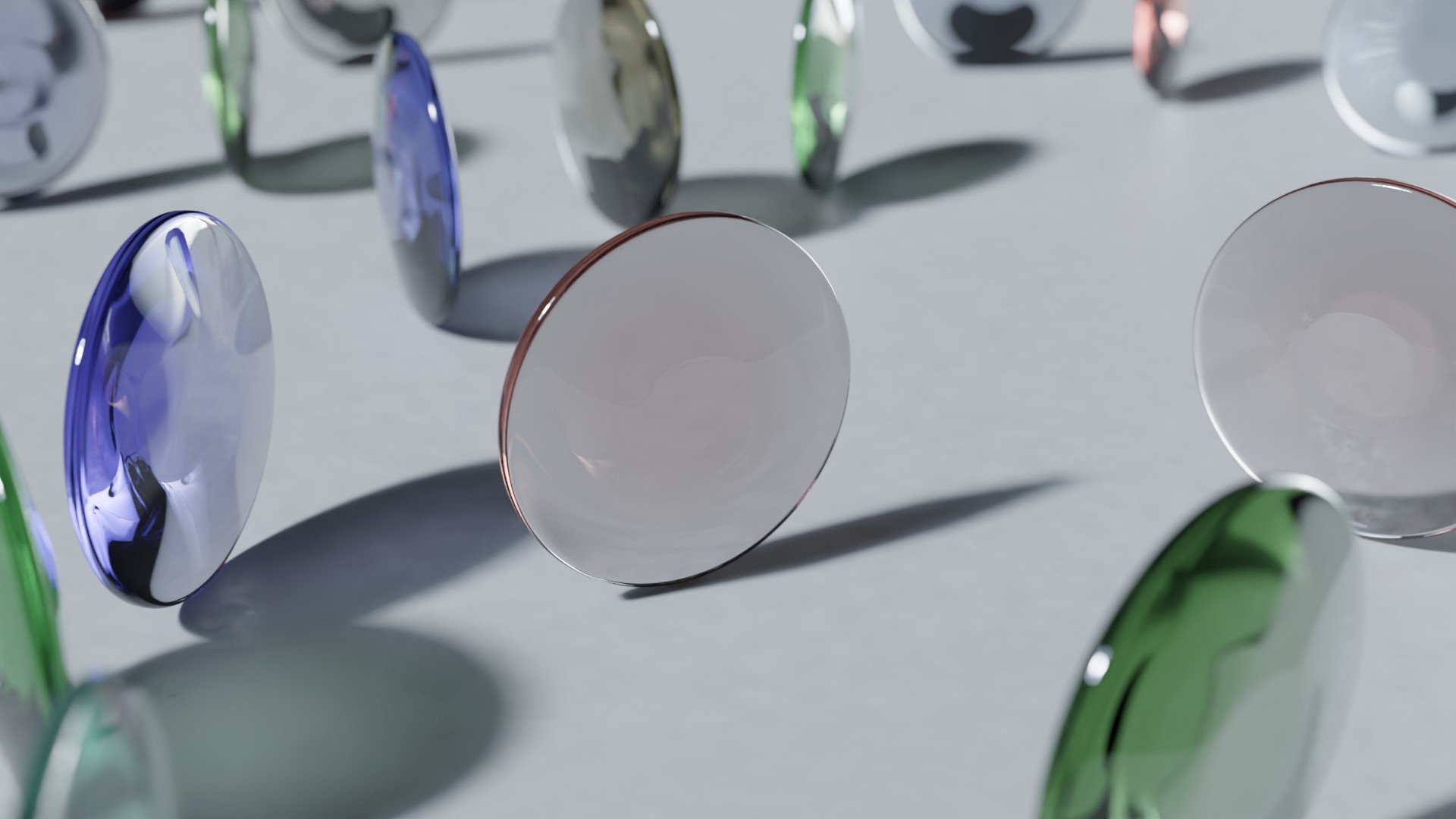 下のようなシーンを例にしてみましょう。これは配列モディファイアーとランダムトランスフォームを使って作成したもので、オブジェクトには色の付いたガラスのマテリアルを適用しているのですが、今の状態だと一つの色しか無いので、少し物足りない感じがします。