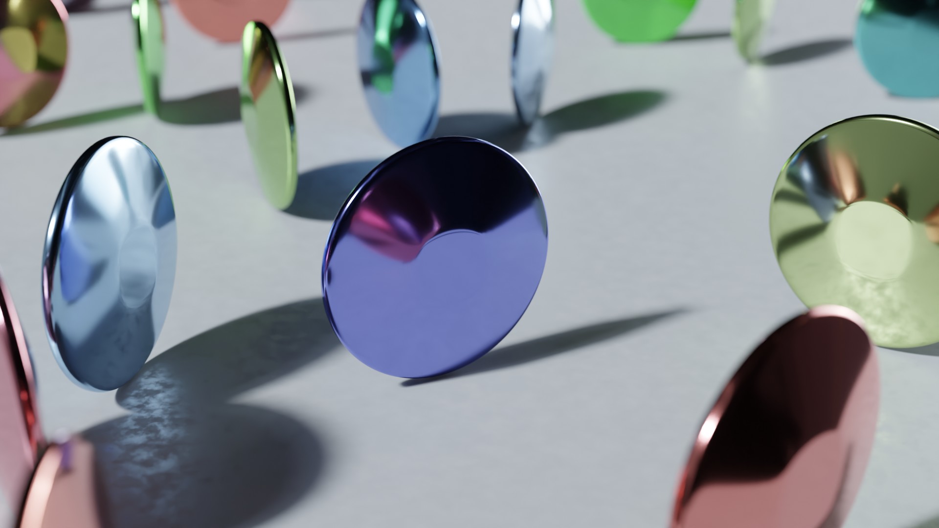 同じ様に金属マテリアルにも反映可能です。前述した方法と同じく、プリンシプルBSDFの「ベースカラー」に作成したノード群接続して、プリンシプルBSDFの「メタリック」と「粗さ」を調整することで、金属マテリアルにランダムの色を適用できます。