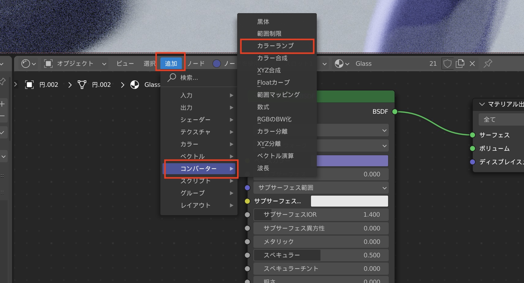 ガラスのマテリアルを例にしてみましょう。「ベースカラー」をデフォルトに戻し、「伝播」を「1」にしたプリンシプルBSDFに加え、「ボリュームの吸収」ノードをマテリアル出力の「ボリューム」に接続して色付きガラスのマテリアルを作成しました。
