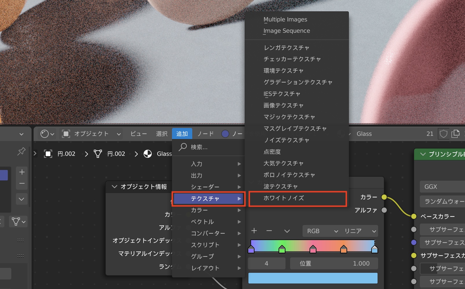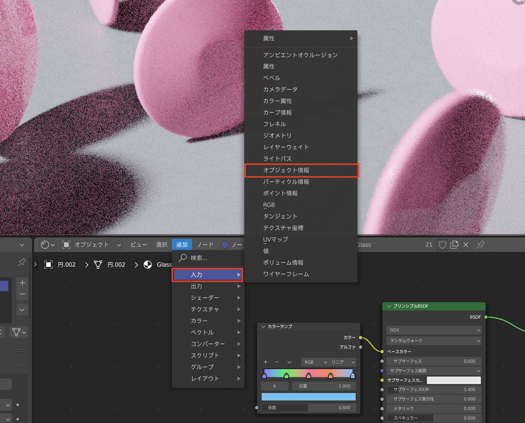 現在、カラーバンドの中央に表示されている色がオブジェクトに反映されている状態です。「Shift + A」または「追加」の「入力」の中にある「オブジェクト情報」をクリックしてノードを追加します。