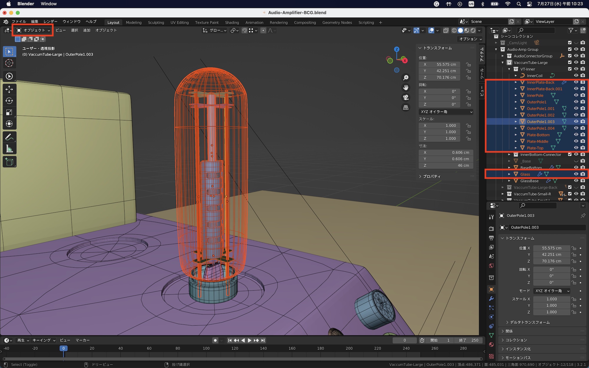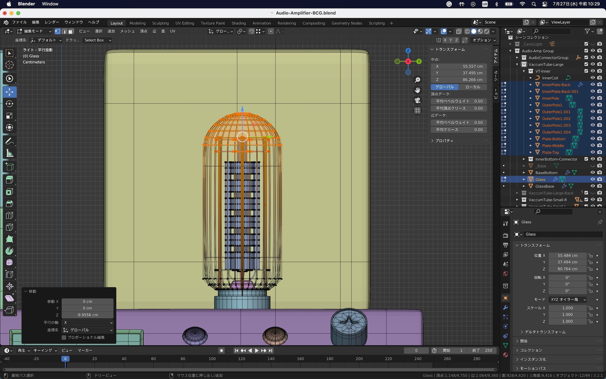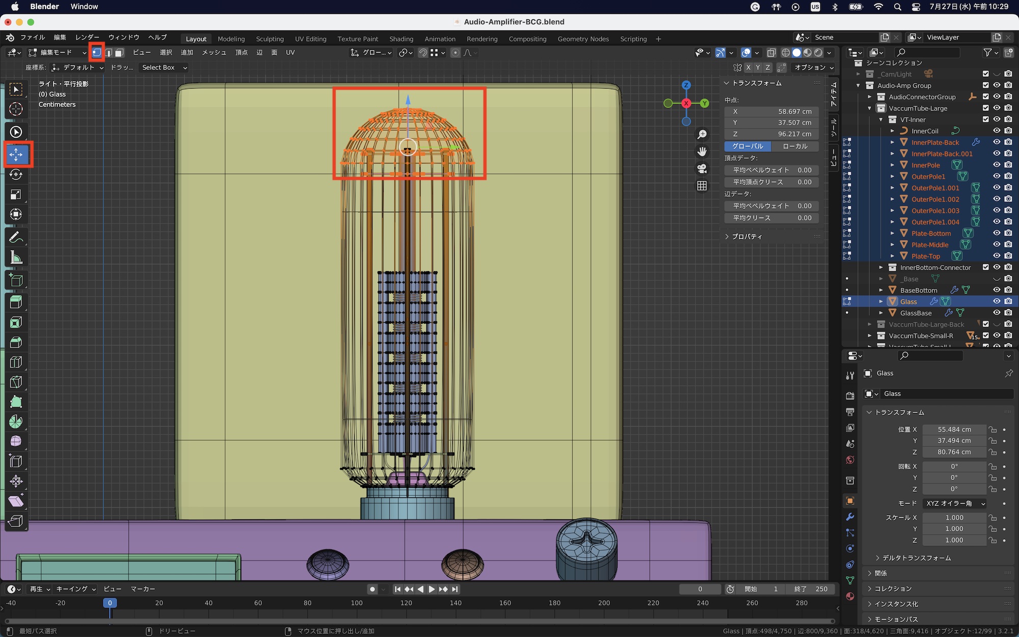 先ほどの真空管のオブジェクトを例にしてみると、操作が必要なものは外側のガラスと内部の上部パーツのみになるので、アウトライナーで該当するオブジェクトを選択した後、頂点ツールと移動を使って、オブジェクトの高さを調整しました。