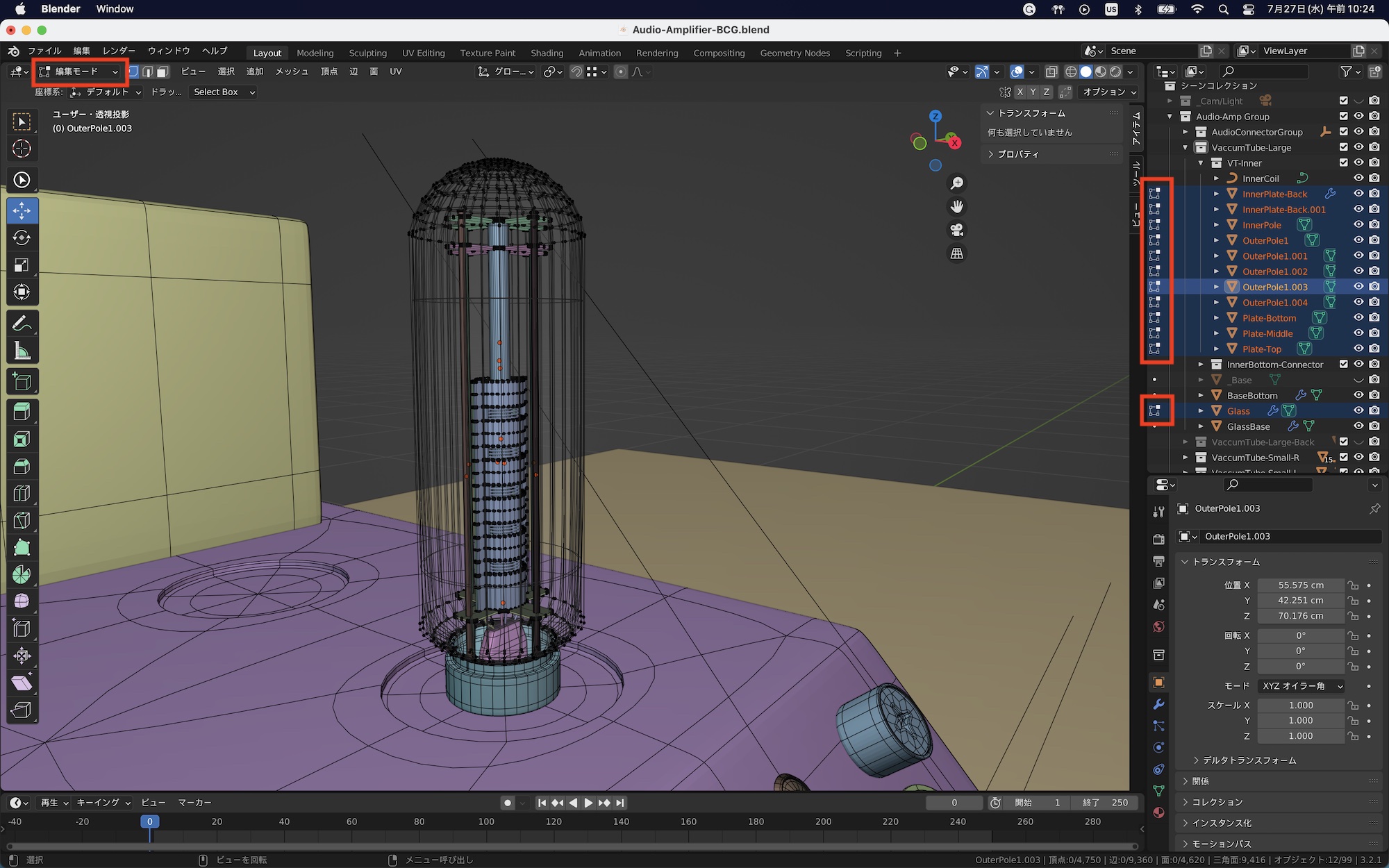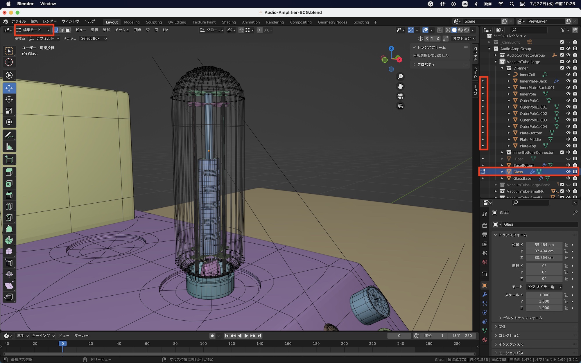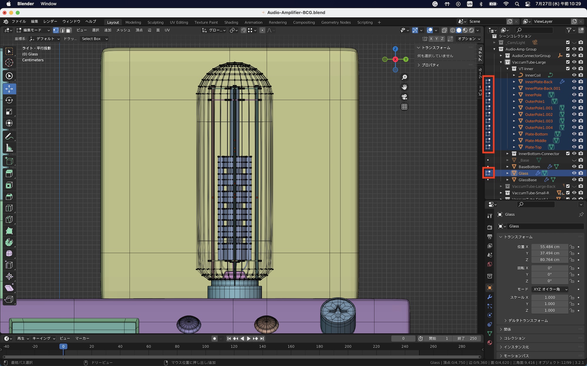 先ほどの真空管のオブジェクトを例にしてみると、操作が必要なものは外側のガラスと内部の上部パーツのみになるので、アウトライナーで該当するオブジェクトを選択した後、頂点ツールと移動を使って、オブジェクトの高さを調整しました。