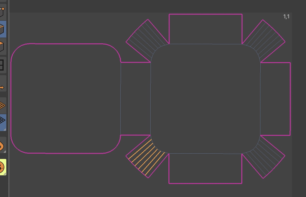 この「スマートUV投影」はオブジェクトの形を判別して自動でUV展開を行ってくれるツールです。非常に便利ではあるものの、オブジェクトによっては上手く行かない場合もあるので、その際は次の項目で紹介する「シーム」を追加して手動でUV展開を行うと良いでしょう。