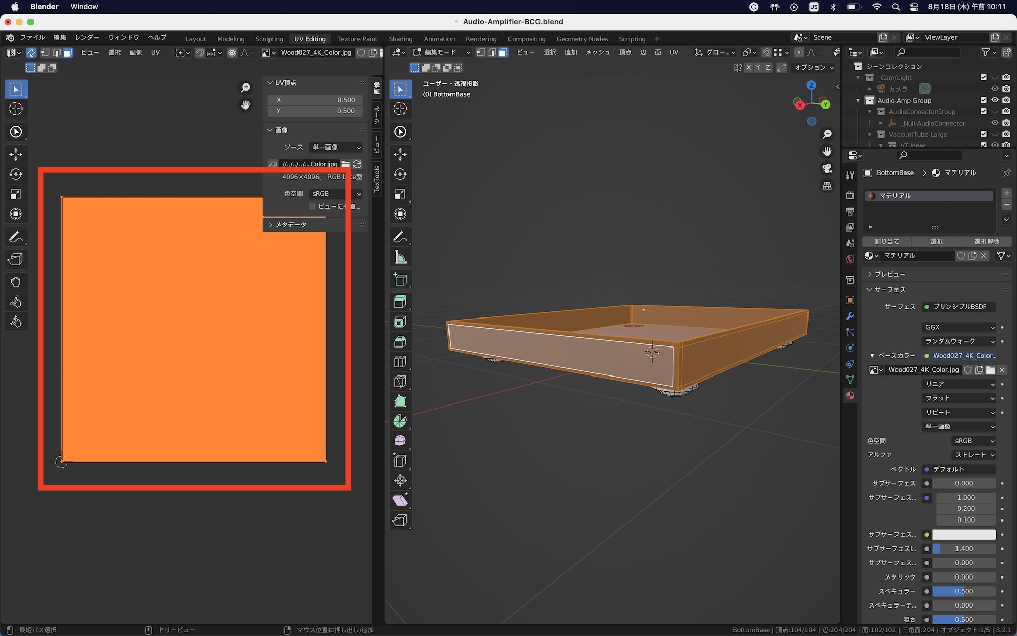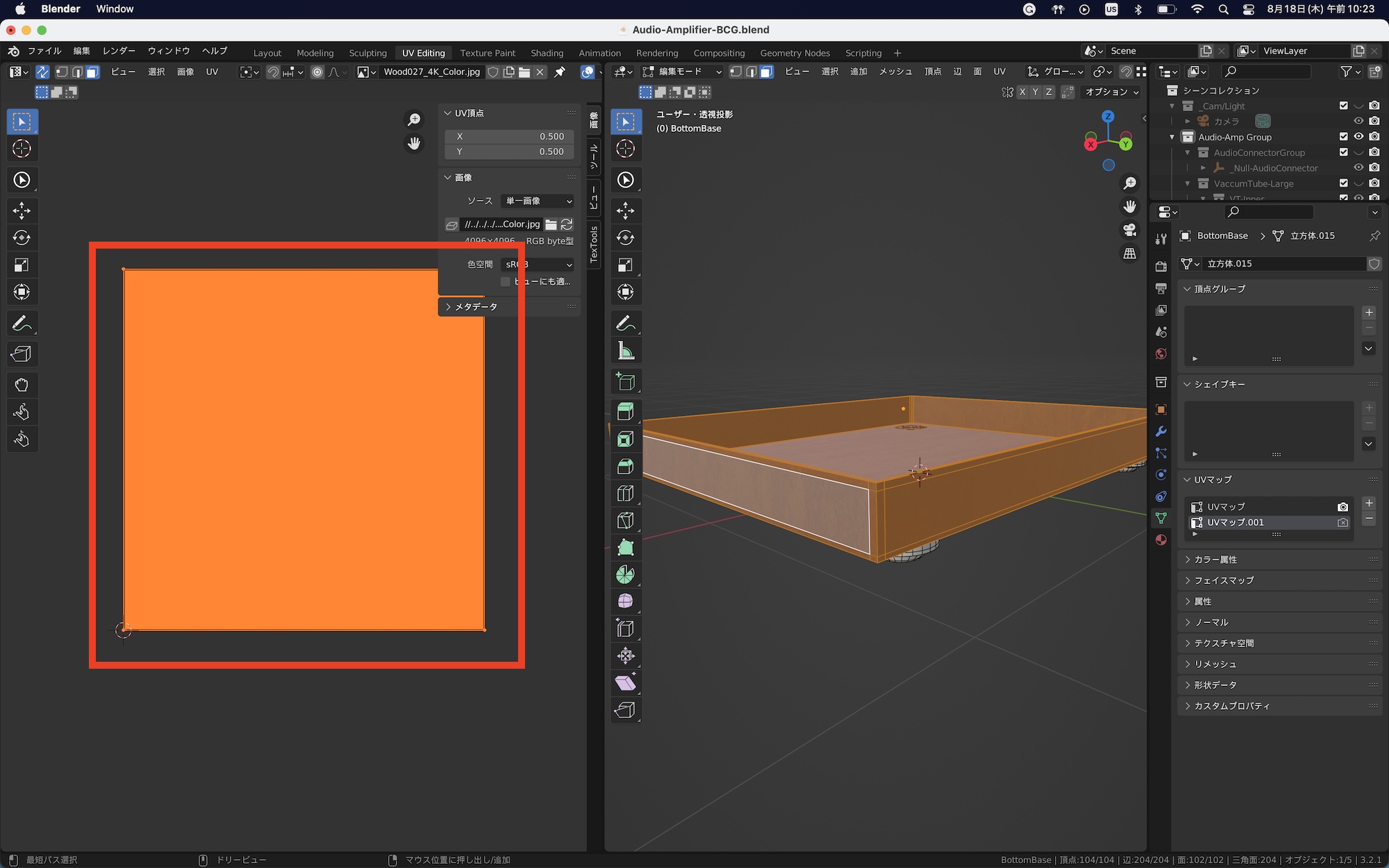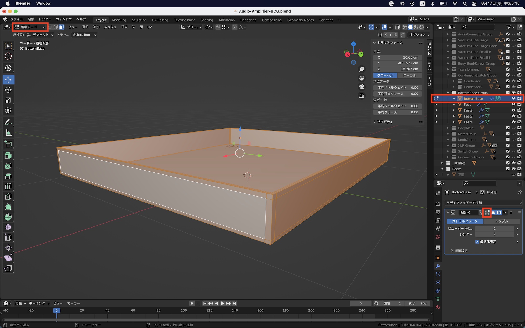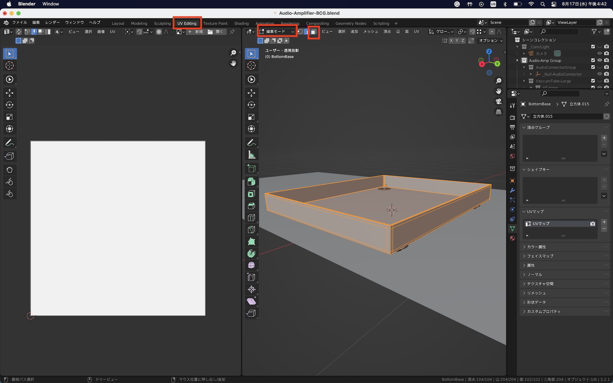 今回はオーディオアンプのベース(土台)に木材のテクスチャを反映させます。ベースのオブジェクトのみを表示させて、編集モードの面選択モードにし、「A」キーを使って全ての面を選択します。