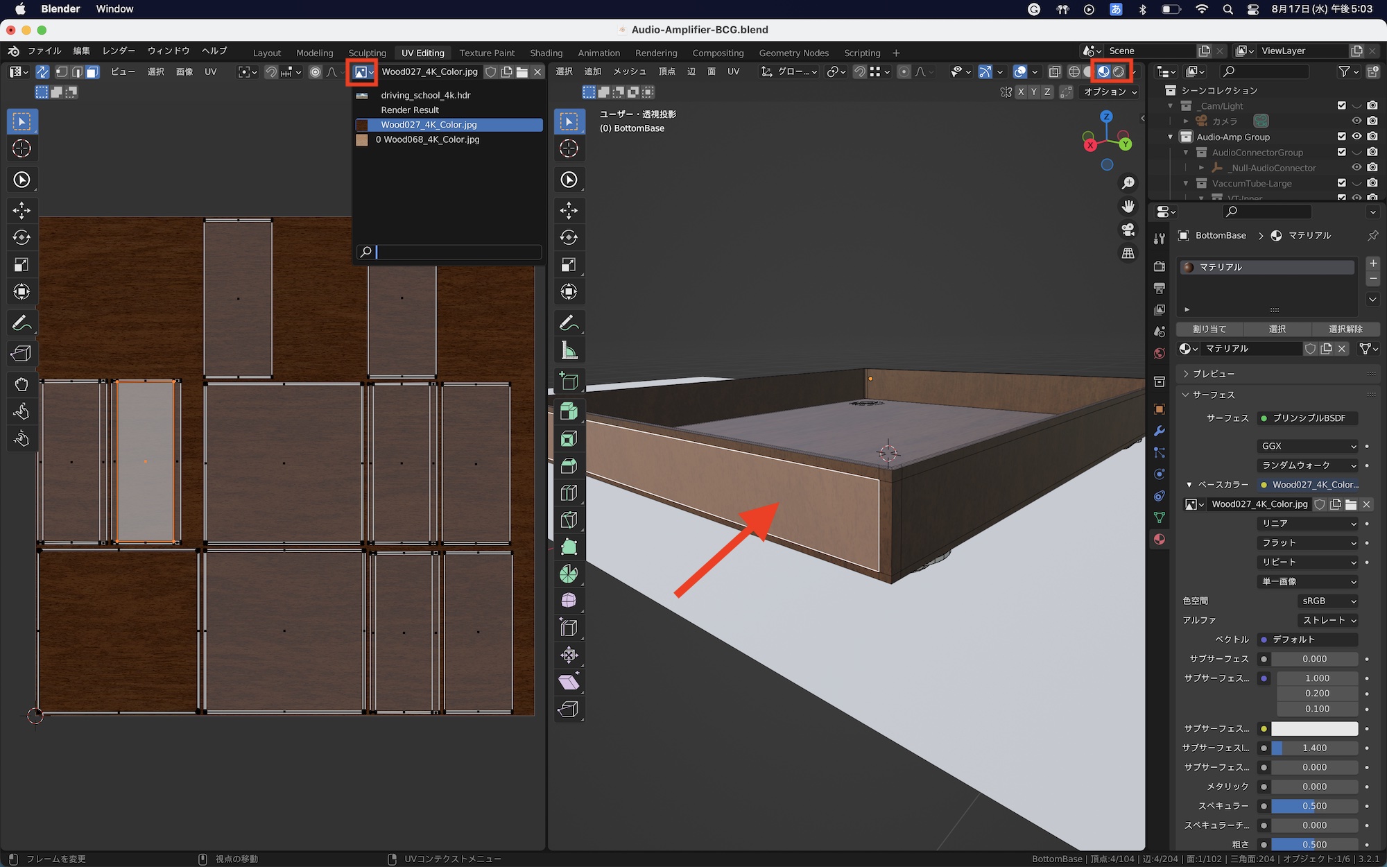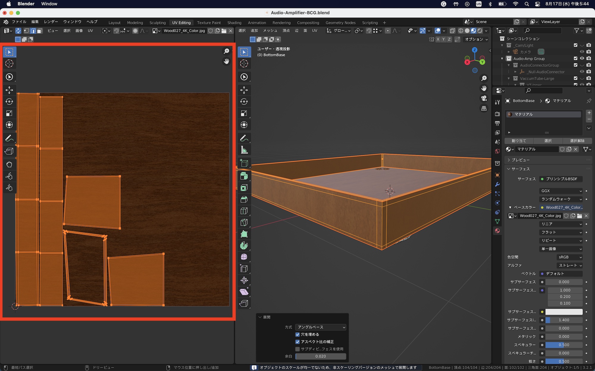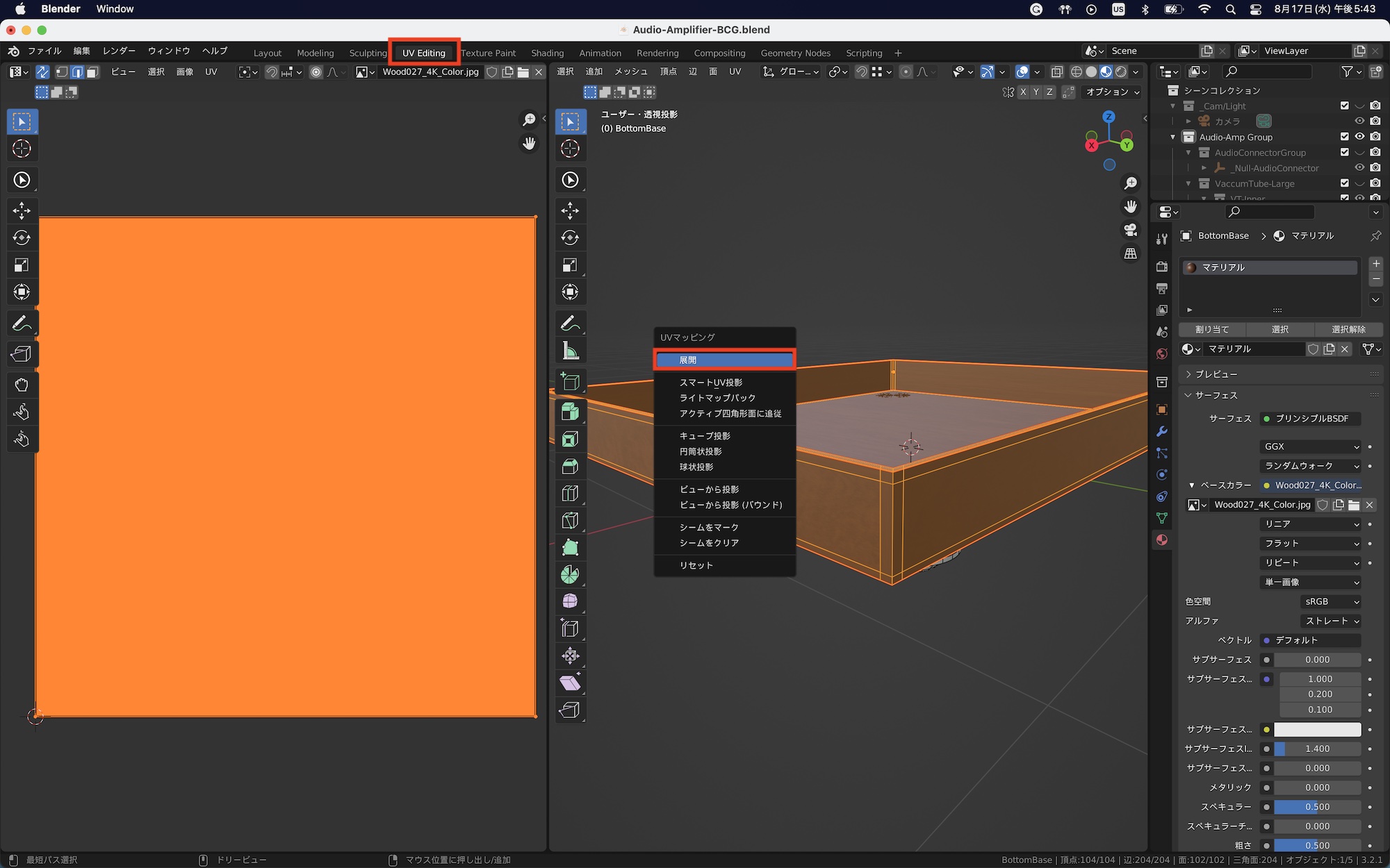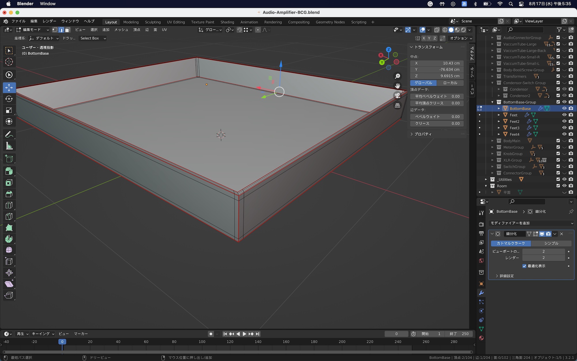 今回はオーディオアンプのベース(土台)に木材のテクスチャを反映させます。ベースのオブジェクトのみを表示させて、編集モードの面選択モードにし、「A」キーを使って全ての面を選択します。